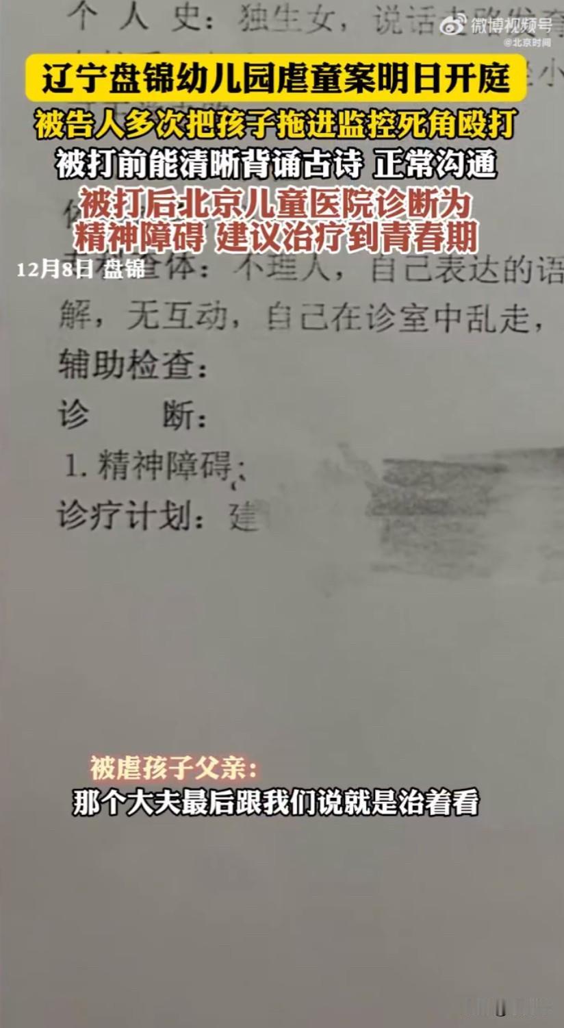 辽宁盘锦那起让人揪心的幼儿园虐童案,马上就要开庭审理了。这事儿从曝光以来就一直牵动着大家的心,尤其是受害孩子的遭遇,更是让无数家长心疼又愤怒。孩子的爸爸孟先生说,女儿刚去盘山县鹏程幼儿园的时候,还是个聪明伶俐的小宝贝,不仅能清晰地背诵古诗,跟大人交流也顺畅又可爱,谁看了都喜欢。可谁也没想到,本该是孩子安全港湾的幼儿园,却成了伤害她的地方。 后来家长慢慢发现不对劲,孩子变得特别怕生,天天晚上哭闹着不肯睡觉,还总要求大人抱着,以前活泼开朗的性子完全没了,连正常沟通都变得困难。更让人揪心的是,他们在孩子身上发现了多处瘀青,追问之下才意识到事情不简单。调出幼儿园的监控一看,眼前的画面让夫妻俩瞬间崩溃:女儿多次被老师拖到监控照不到的死角里殴打,除了直接打骂,还有推头撞墙、用被子捂、强迫吃剩饭这些五花八门的虐待手段。更让人愤怒的是,监控里不止一位老师动手,包括园长、教师还有厨师在内的10名工作人员都参与了虐待,短短十几天里,虐童行为就上演了上千次。 之后家长赶紧带着孩子去北京儿童医院检查,诊断结果让全家人陷入绝望:孩子患上了精神行为异常,也就是精神障碍。现在的她连“几岁了”这种简单的问题都回答不上来,语言表达模糊,还会在屋里乱走、情绪喜怒无常,完全没法正常生活和上学。医生说,孩子的情况需要长期治疗,可能要一直治疗到青春期,能不能完全恢复还不好说。 事情曝光后,涉事的鹏程幼儿园被永久关停,园里的其他孩子也被分流到了公立幼儿园。警方后来对4名涉事人员做出了行政拘留的处罚,其中一位叫张某的老师因为情节特别恶劣,被转为刑事拘留,之后由检察院以虐待被看护人罪提起公诉,这也是这次开庭的被告人。但家长们觉得这样的处理不够,监控明明拍到10人都参与了虐待,现在却只有一人被追究刑事责任,其余人要么只是被行政拘留,要么仅仅被幼儿园开除,他们希望所有施暴者都能受到法律的严惩,给孩子一个公道。 孩子的妈妈现在一提起这事就忍不住落泪,他们全家没要过一分钱经济赔偿,唯一的诉求就是让所有伤害孩子的人付出应有的代价。这起案件不仅让一个原本健康可爱的孩子失去了快乐童年,也引发了大家对幼儿园监管的关注,希望这次庭审能还受害家庭一个公正,也能让更多幼儿园重视安全和管理,不让这样的悲剧再发生。幼儿园虐童 儿童被虐案 病态虐童 来源:北京时间