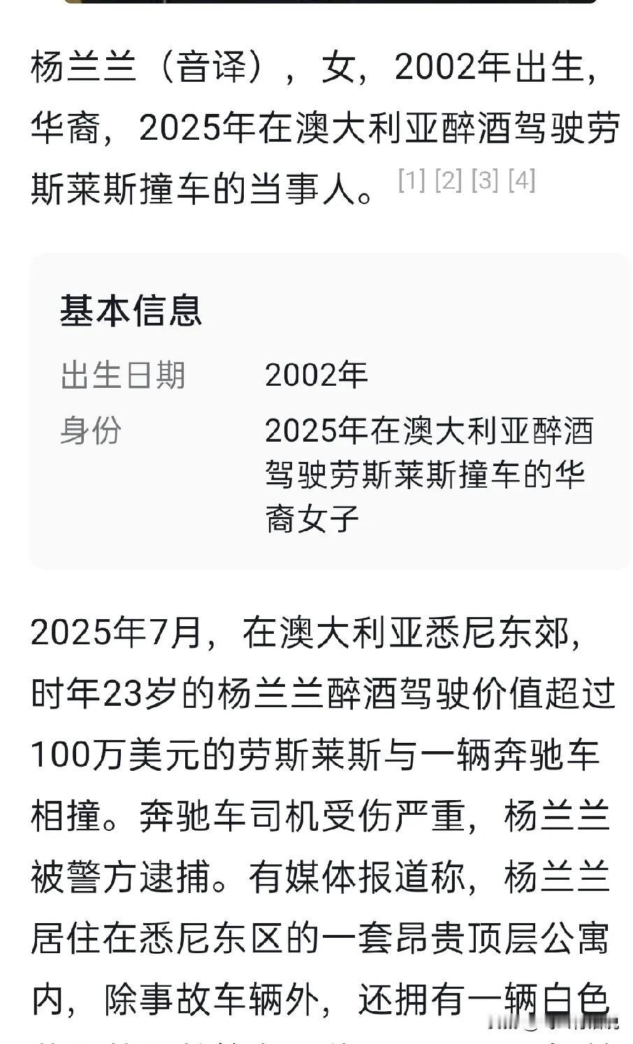 网络再强大,都没有搞清这个澳大利亚杨兰兰的女人身份 看来,身份是谜团,财富也是谜团,身后的故事更是谜团 时间长了,大家搞不清这个人,也就慢慢忘记这个人了 而词条上记忆,也仅仅是车祸和财富 更不要说普通人了