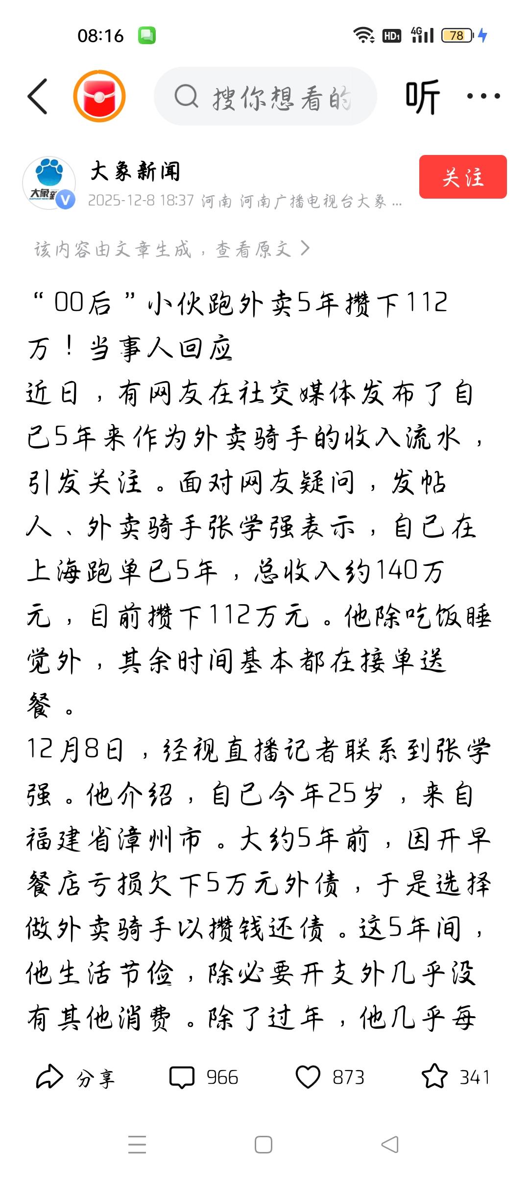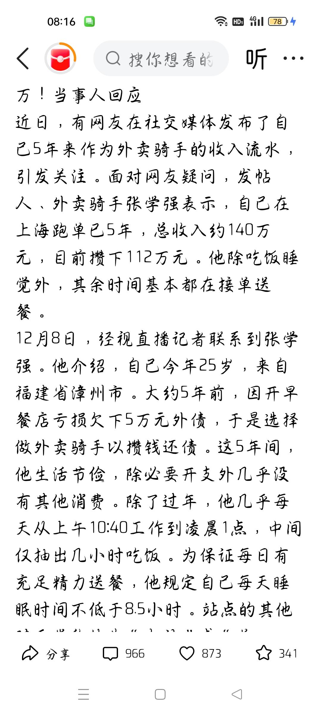 00后小伙跑外卖5年攒下112万,我想说 据大象新闻报道,00后小伙张学强在上海跑外卖,5年收入约140万,还清外债,还攒下了112万,他说每天保证8小时半时间休息,其余时间都在跑外卖,我想说,有人算他一年收入约28万,一个月两万多,个人认为,作为外卖骑手估计也有诀窍,小张掌握了诀窍,加上勤劳,口碑好,自然订单如雪片一样飞来。个人认为靠勤劳致富,值得肯定,个人认为,他可以办外卖骑手培训班,分享他的成功经历。各位条友觉得呢?