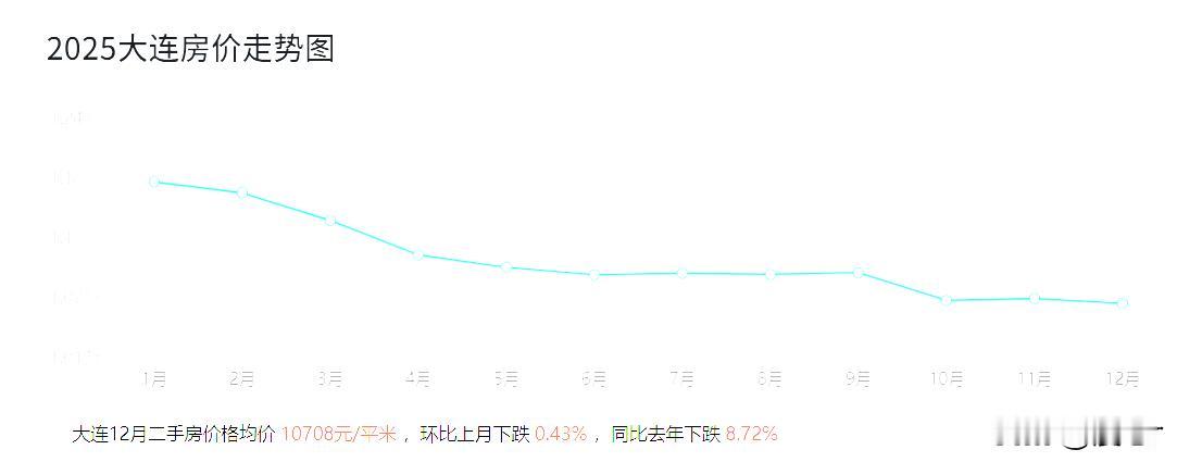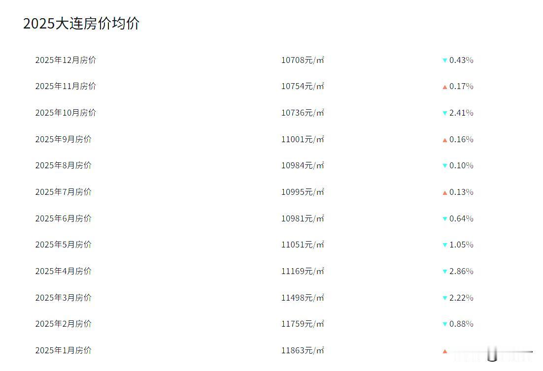2025年1月,大连房价均价11863元; 2025年2月,大连房价均价11759元; 2025年3月,大连房价均价11498元; 2025年4月,大连房价均价11169元; 2025年5月,大连房价均价11051元; 2025年6月,大连房价均价10981元; 2025年7月,大连房价均价10995元; 2025年8月,大连房价均价10984元; 2025年9月,大连房价均价11001元; 2025年10月,大连房价均价10736元; 2025年11月,大连房价均价10754元。 2025年1月至11月,大连房价跌幅约1105元,和大连房价最高的2021年11月的15113元比较,下降了约4359元,平均一年下降约1000元。当前大连的房价均价和很多二线城市差不多,比如石家庄、海口、济南、合肥、西安等,在10000-11000之间。 2025年前三季度,大连全市GDP 7248.2亿元,同比增长6.0%。2024年末,大连全市常住人口为754.4万人。从经济总量和城市人口来看,和一些中等二线城市规模相当。 未来,大连这座滨海城市的房价主要还是和经济发展、人口增长等因素成正相关,可以确定的是,在房住不炒的当下,大连的房价一定不会出现之前的暴涨暴跌现象。 以上房价均价数据是参考安居客平台数据,只作为数据分析使用,实际不同区域不同地段的房子价格有显著差异。 那么对于大连的房价均价来说,大家觉得应该在哪个区间比较合适呢?评论区聊一聊。