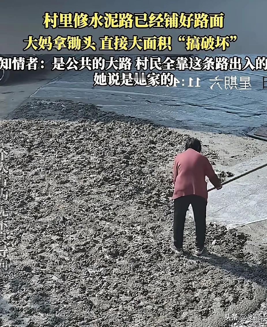 湖南邵阳的一个村庄,一条泥巴路每逢雨天,成了村民的心病,村民多次集资修路,却总被一位八旬老太太阻拦。她横立路口:"谁敢动我的地,我就跟谁拼命!"去年,村民已签好修路合同,施工队刚进场,她便坐在挖掘机前,却硬生生让合同作废。 今年,村民再次动员。牵头人老李,一位年过六旬的汉子,脸上刻满沧桑,却眼神坚定。他挨家挨户劝说:"每人出50元,宽裕的捐500,咱们修条干净路,雨天不踩泥,雪天不滑倒!"村民响应热烈,在外打工的年轻人纷纷汇款,有的甚至多捐几百元。钱凑齐后,施工队迅速进场,三天便将泥巴路铺成平整水泥路。 然而,水泥未干透,闹剧便上演。上午老太太现身,手持锈迹斑斑的锄头,对准新路猛挖。她动作利落,仿佛与锄头融为一体,每一锄都带着恨意。村民小王上前劝阻:"大娘,这是公家的地,您老宅离路口15米远,早就不住这儿了!"老太太瞪眼反驳,声音尖锐如刀:"公家?地是我的!谁修路占我的地,我就挖谁的!" 老太太越挖越猛,从路口到村中,100平方米的路面被刨得坑坑洼洼,水泥碎块飞溅,如一场小型风暴。村民老张试图夺锄,却被她一把推开:"滚开!别碰我的锄头!"她的力气出奇的大,老张踉跄几步,差点摔倒。村民报警四次,警察到场时,她正喘着粗气,汗水浸透衣衫,却眼神依旧坚定。警察苦劝无果,最终强行制止。三个小时后,路已不成形,村民的心血化为乌有,孩子们脸上的笑容消失了,取而代之的是失望与困惑。 老太太不住村中,新路对她毫无用处。村民修路为的是"雨天不踩泥",她却因私利破坏公益。她的锄头,不仅挖坏了路,更挖碎了村民的信任。