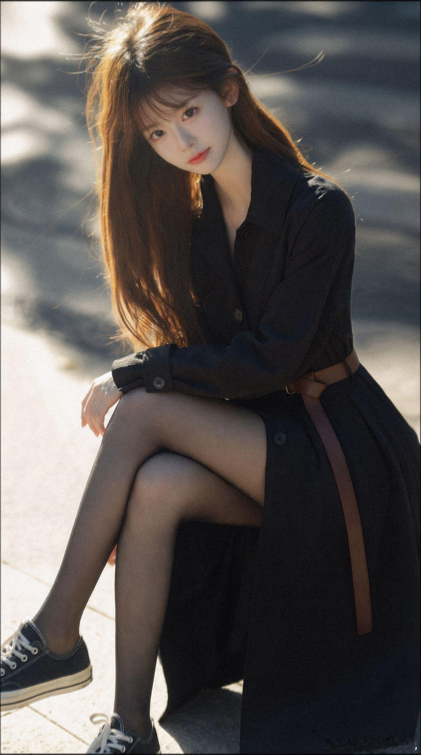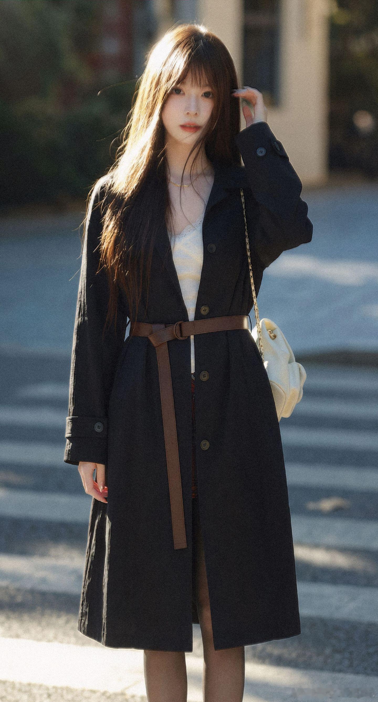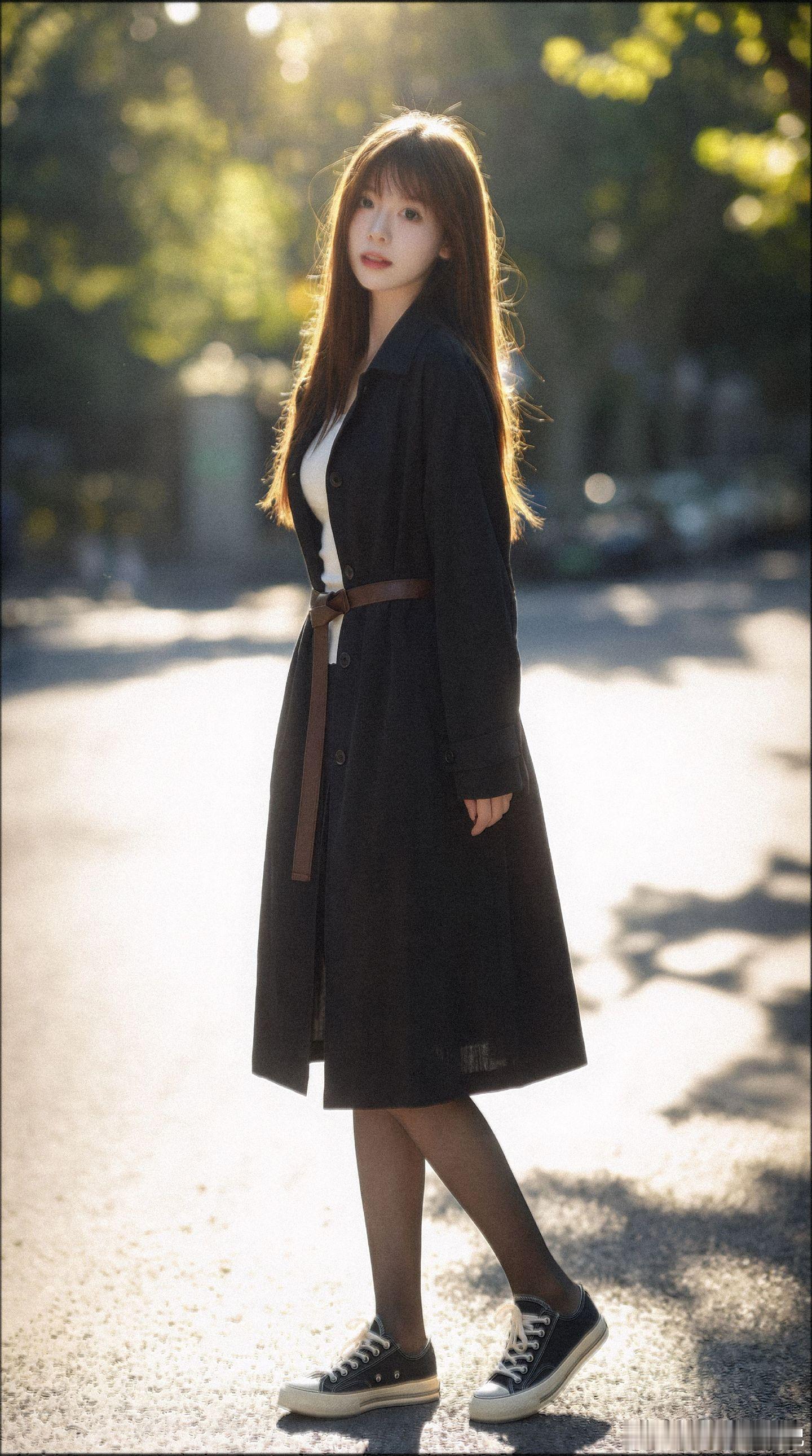 美女穿搭写真 白色蕾丝打底,风衣,黑丝,布鞋,冬日暖阳美女绘梦长廊