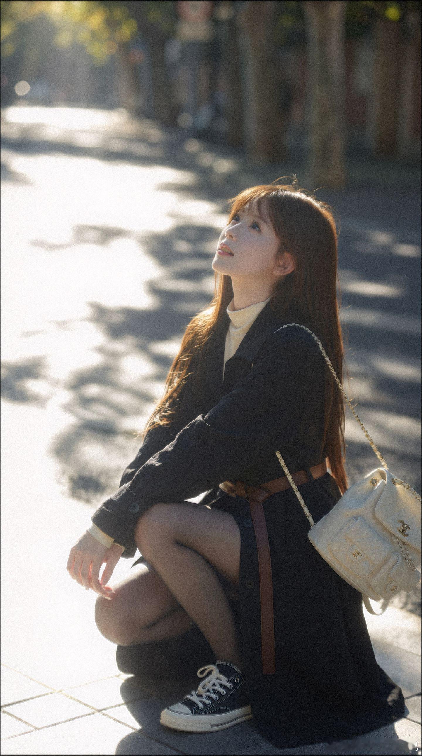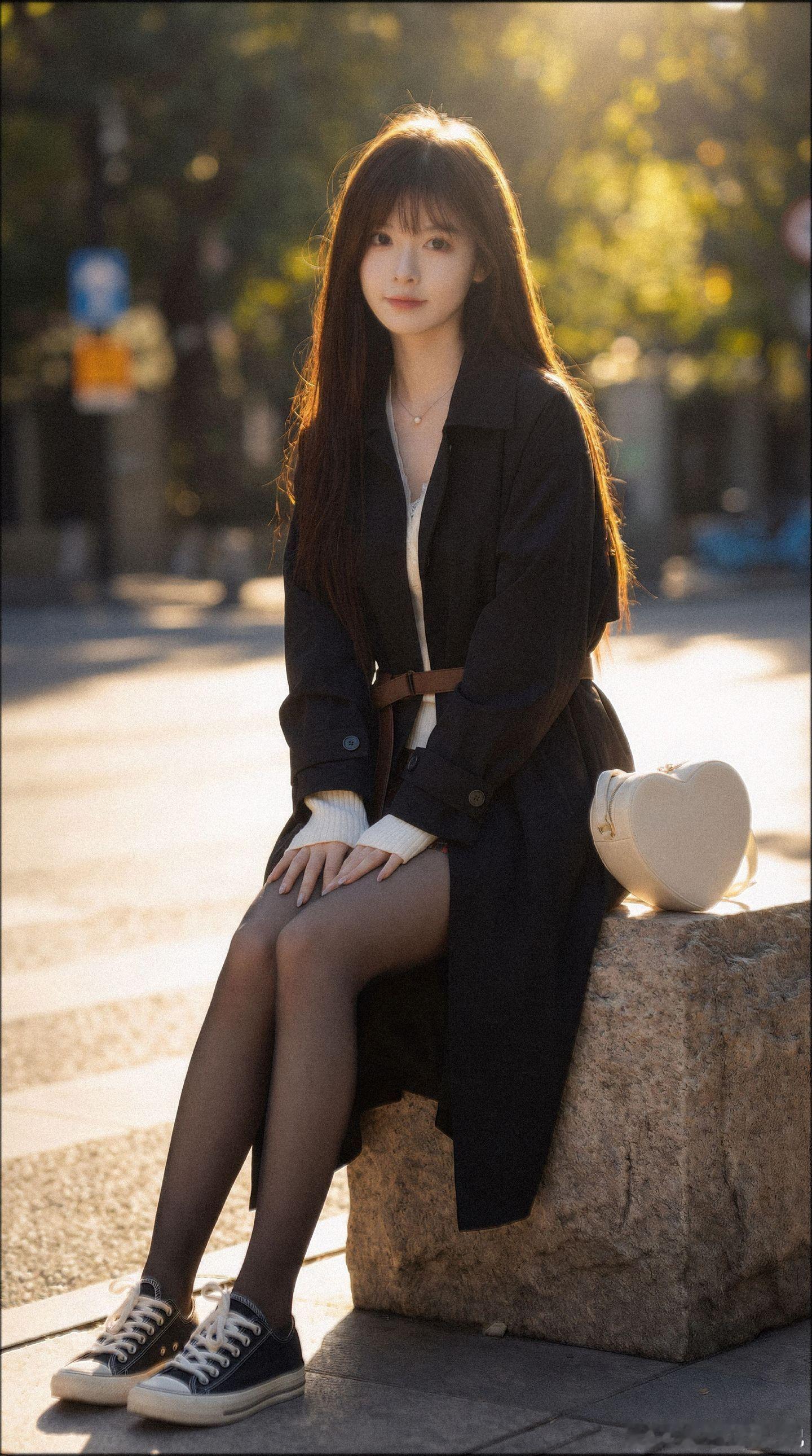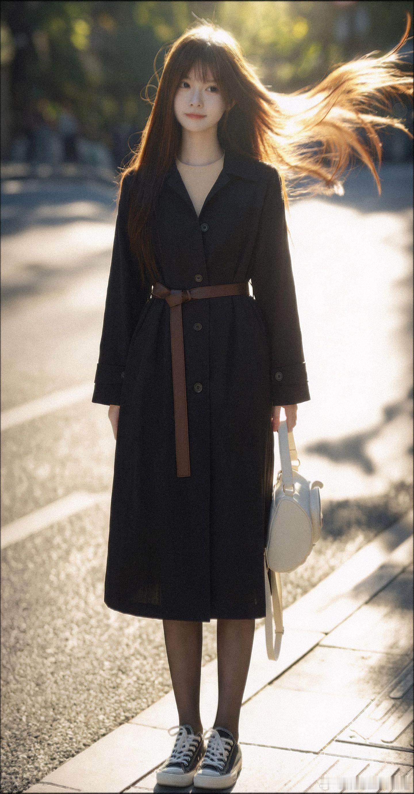 美女穿搭写真 白色蕾丝打底,风衣,黑丝,布鞋,冬日暖阳美女绘梦长廊
