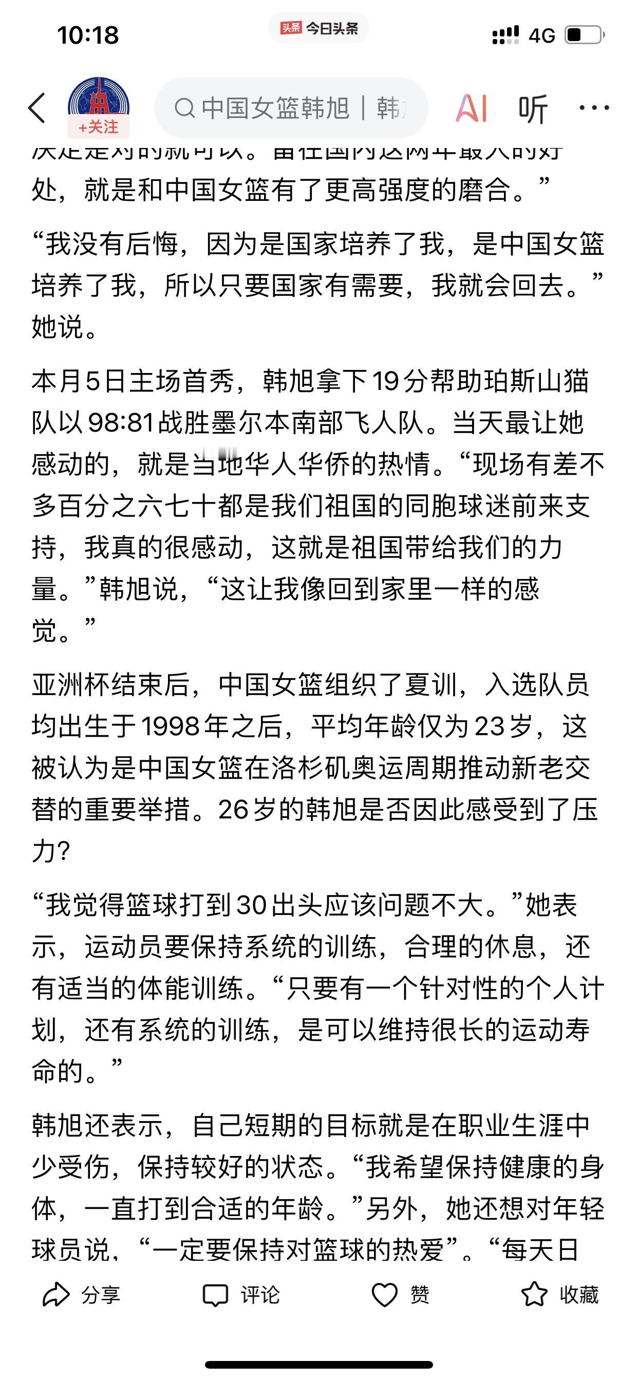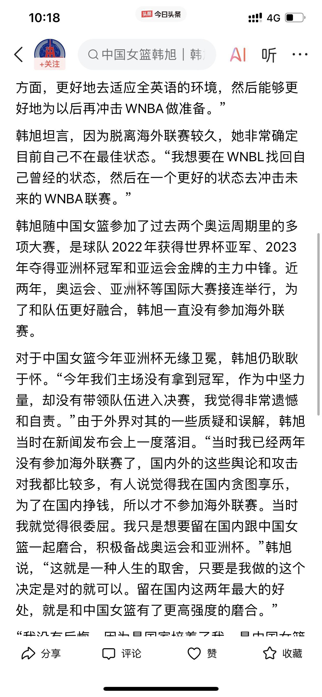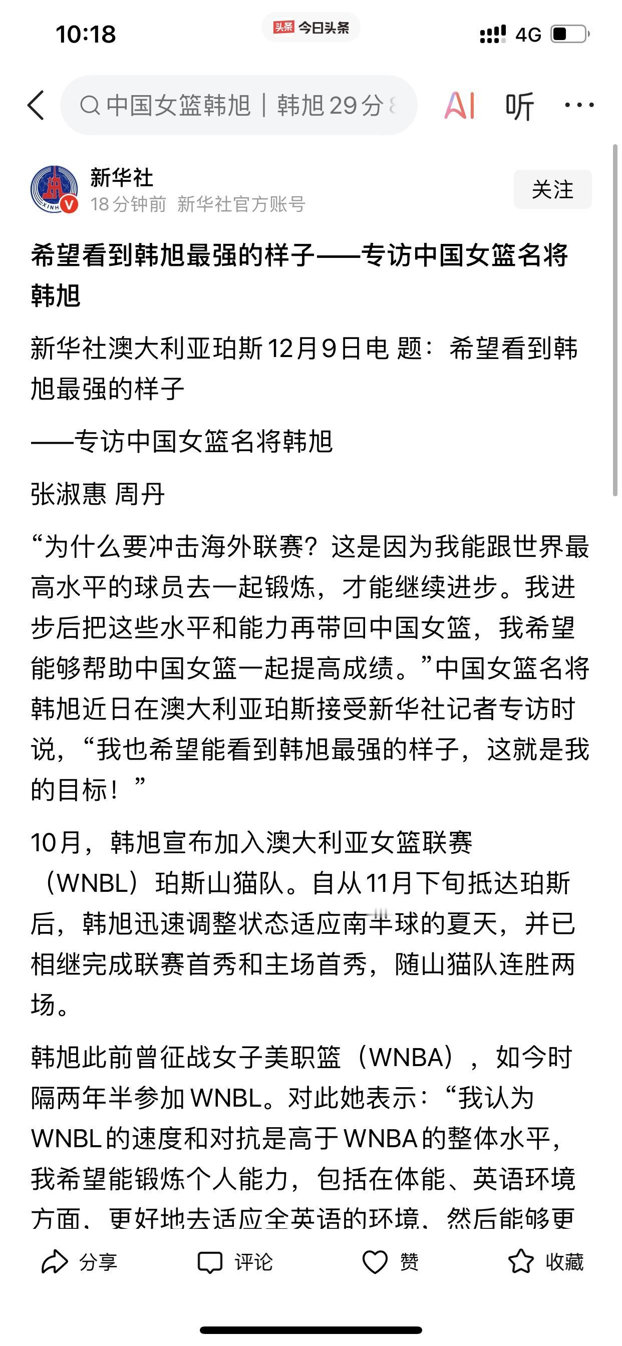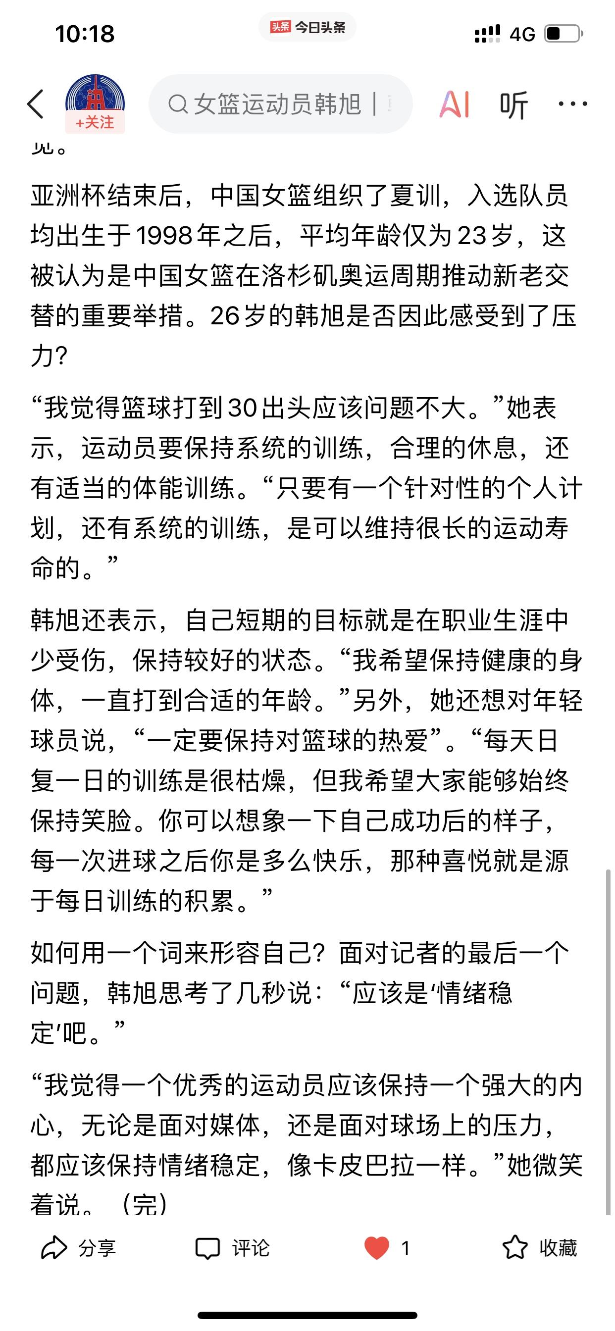 新华社专访中国女篮韩旭! 韩旭说:“我也希望能看到韩旭最强的样子,这就是我的目标!” 从这句话,我看到了一个女子篮球运动员对自身的追求,或者应该说对追逐自身、打破自身的一种令人佩服的意志和态度 通过这个专访,可以看到韩旭已经历经了一次自我的心理洗礼之旅 她不仅把亚洲杯未能卫冕的失利当作自己的问题,更是把它当作自己的前进动力之一 她已经可以从容的面对外界的无聊言论和可笑的质疑! 所以她一到澳洲女篮联赛,一开局就能砍下全队最高分,第二场依旧拿下精彩数据! 因为韩旭技术没有问题,而是内心的煎熬,而成功踏上WNBL,说明她在内心战胜了自己! 加油,韩旭! 必胜,韩旭!