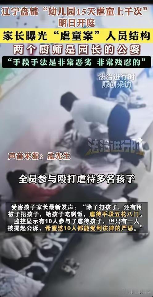 辽宁盘锦这所幼儿园的操作真的突破人性底线! 10个人包括园长在内,15天虐童近千次,给孩子吃混着剩饭的“大锅饭”,推头撞墙、用被子捂、拿棍子打,3岁女童原本2岁就能背诗,现在直接被虐到精神失常,连自己名字都不知道了。 更讽刺的是园内装着监控,却成了施暴的“见证者”而非“守护者”,监管的缺位才让这些人有恃无恐。 幼教的核心是爱心和责任,不是谁都能当老师,准入门槛的松懈、监管的流于形式,才是这类悲剧反复上演的根源。 今天案件开庭,严惩施暴者是必须的,但更该建立终身禁业的黑名单,让监管真正“醒着”,而不是等出事才追责。 你觉得该怎么从根源上守住孩子的校园安全?幼儿园虐童 幼儿园乱象 幼师刺人案 幼儿园寒心 常州幼儿园虐童 保姆虐童 青岛虐童