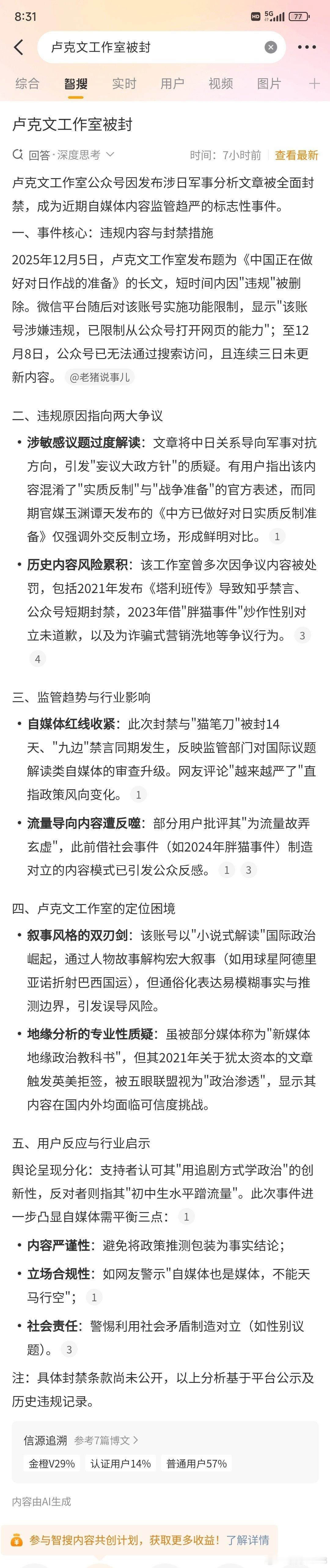 卢克文公众号被封当450万粉丝的头部自媒体“卢克文工作室”因一篇题为《中国正在做好对日作战的准备》的文章遭微信全面封禁,这场围绕“爱国流量”与“监管红线”的碰撞瞬间引爆全网激辩。这家伙比夹头更能蛊惑人,“爱国生意”做得那么好,没想到这次表演过度而撞墙。