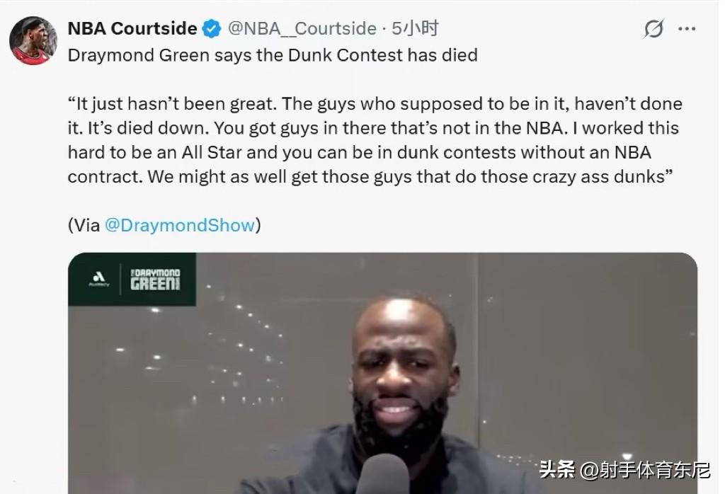 扣篮大赛已过气?? 追梦格林在最新一期的播客节目《绿说》中聊到了如今的扣篮大赛。 追梦表示:“这项赛事的水准早就大不如前了。本该站上这个舞台的球员,根本没有参与进来,赛事的热度也彻底降温了。以前可以参加全明星大赛各项赛事是球员身份和实力的见证,现在情况完全不同。既然NBA现役球员不愿意参加,联盟不如从外面请一些有扣篮天赋的狠人来参赛。” 以前的球星敢于竞争,勇于竞争,谁也不服谁,用行动证明自己天下第一。比如乔丹,明知3分投射不是自己的强项,依然勇敢参加3分大赛挑战。比输可以输,但自己不能未战先认输。现在的所谓球星除了口嗨“我参加扣篮大赛绝对夺冠,但参加的时机过了”或者自封“我是联盟第一人、是历史GOAT”,但我只在乎自己的数据和商业利益,联盟的发展和自己无关。甚至到最后一刻才公布自己有“智能伤病”,不能出战全明星,也不提前告知联盟,好让联盟补充其他球星。说白了就是现在的球星德不配位,没有觉悟和认知承担起所谓联盟头牌的责任和义务。