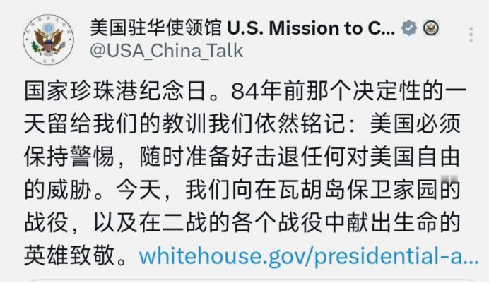 12月8日,美国驻华使领馆发文:“国家珍珠港纪念日。84年前那个决定性的一天留给我们的教训我们依然铭记:美国必须时刻保持警惕,随时准备好击退任何对美国的威胁。今天,我们向在瓦胡岛保卫家园的战役,以及在二战的各个战役中献出生命的英雄致敬。” 说白了,这两个国家的关系其实并没有好到哪里去,虽然美国没有指出是谁炸的,但他们一直都未曾忘记。日本其实也是,虽然现在都在受着核侵害,但是却对美国只字不提,他们现在只不过是战略上互相利用而已。 要知道,美国很久前就在遏制各国的经济发展,从而能让他们的霸权能稳压全球,但是没想到,这反而让中国走出了一条“越压越强”的逆袭之路。 说实话,如今美国再想遏制中国的发展,只能靠着别国的战争来牵制中国,但是显然没有好的人选,日本虽然挺合适,但是美国对日本还存在着戒备心。至今日本都没有展开报复,也可能是有着“二战秩序”的原因。 而如今日本已经在国际上表态,要对“二战秩序”提出质疑,想成为“正常国”,美国当然不能放纵日本胡来。 说到底,美日关系就是一场各自都心怀鬼胎的博弈,美国借珍珠港纪念日警示,却又对日本选择性失忆;日本忍下核爆之痛,只为借美国突破“二战秩序”的束缚,这一切的背后,既藏着美国“养虎防华”的霸权算计,又埋藏着日本“借壳崛起”的野心,最终只会让亚太格局陷入更复杂的对抗旋涡。