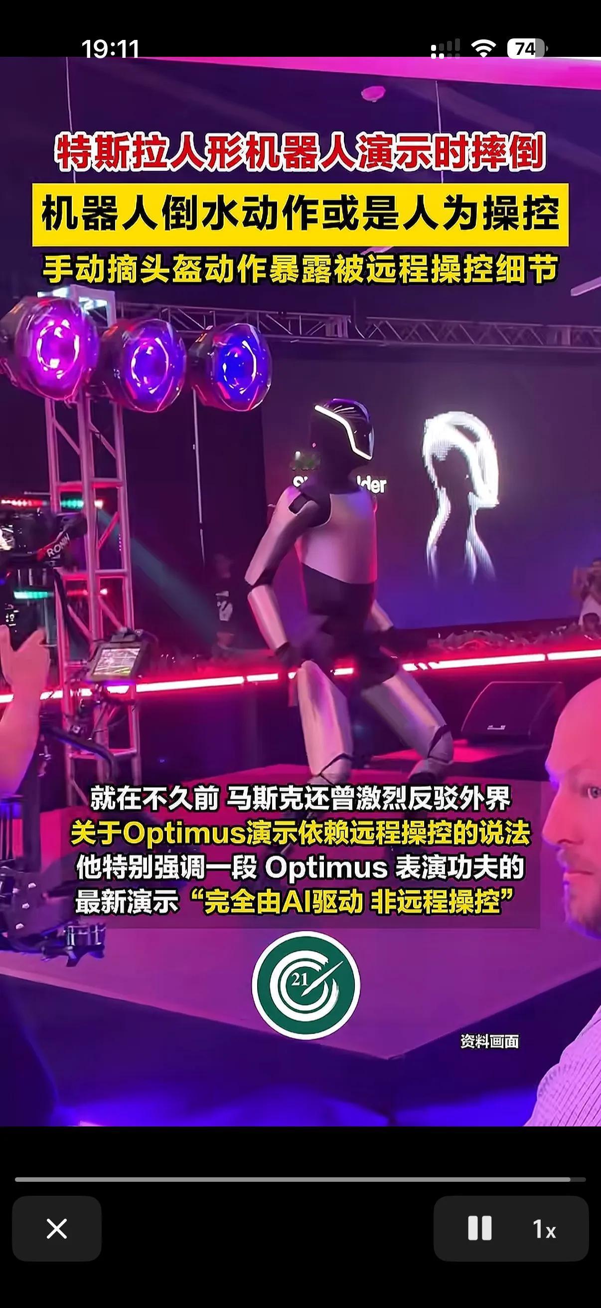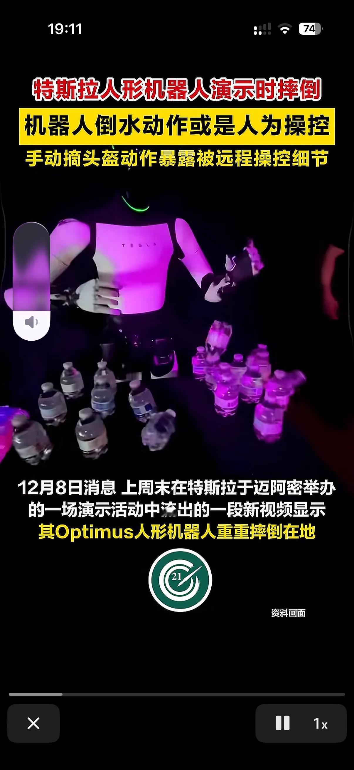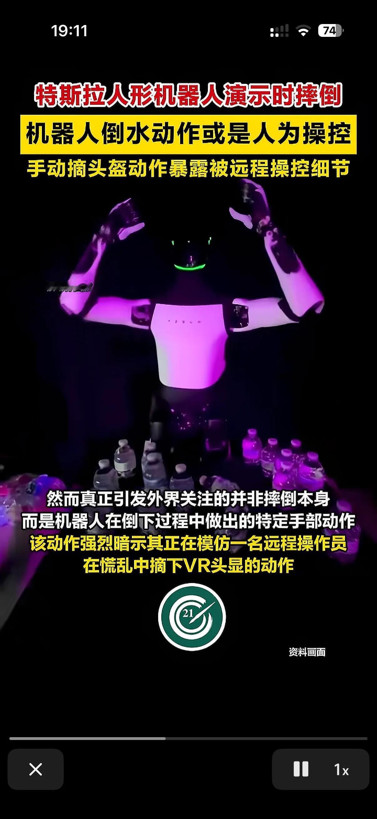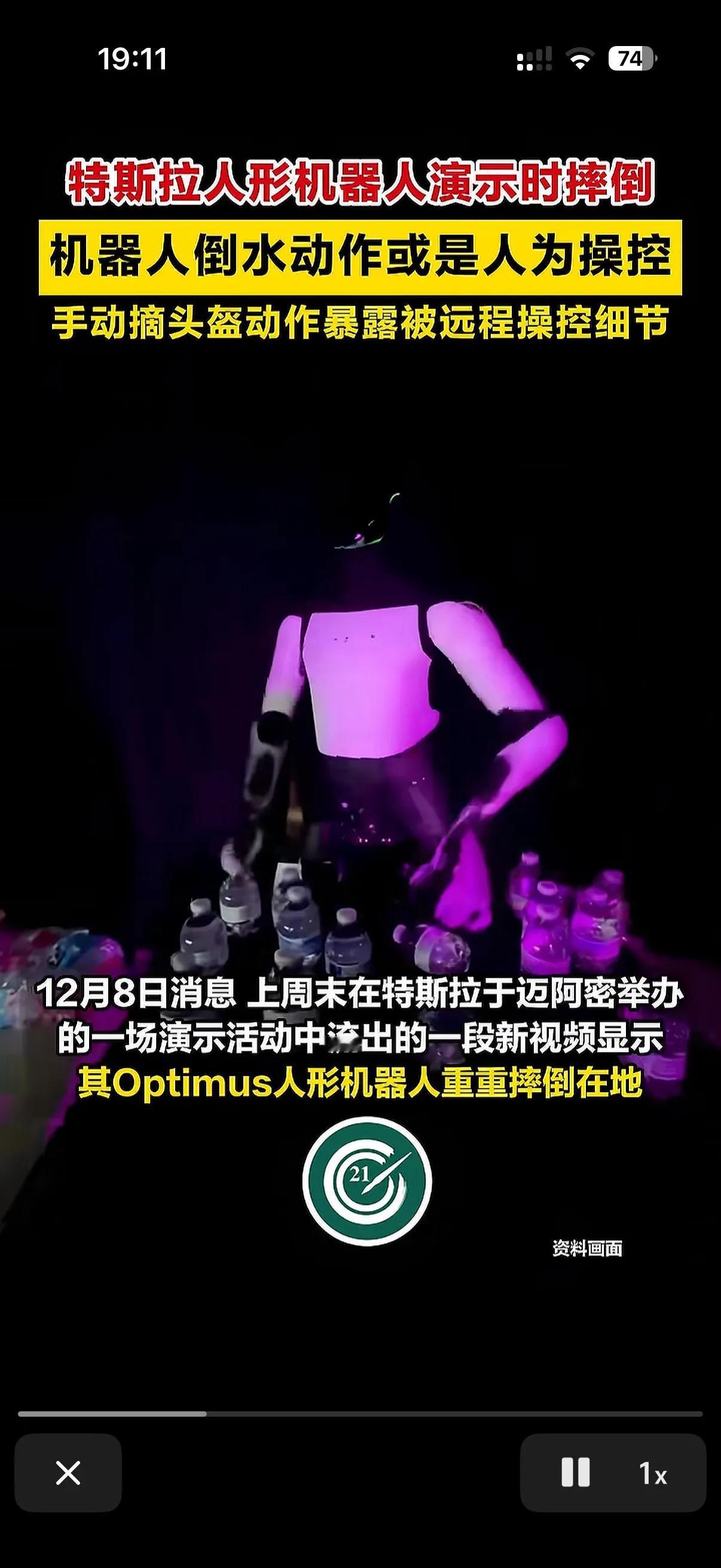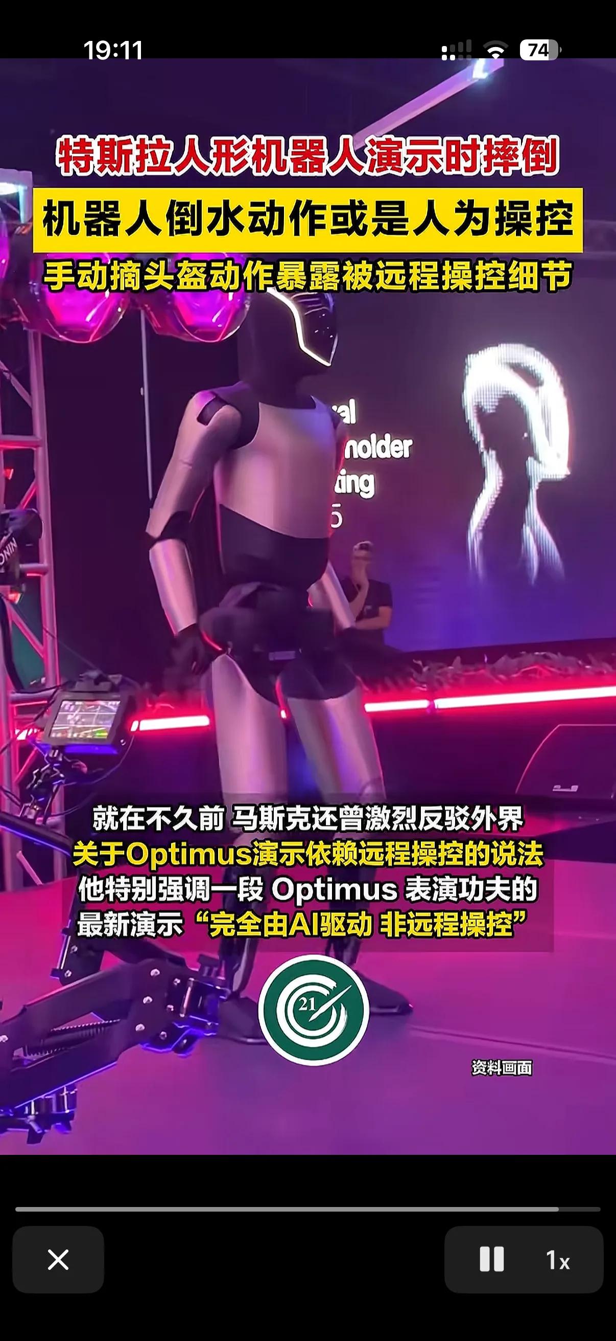 特斯拉机器人疑似造假露馅? 就在昨天特斯拉机器人在迈阿密与参观者互动的时候出现失误! 其实机器人表演失误,大家都不会觉得大惊小怪的,毕竟现在智能机器人刚刚开始,技术不成熟大家都可以理解! 但是在机器人和参观者互动的时候,水瓶突然打翻,然后机器人竟然做了一个举手摘头盔的动作,然后机器人就不出意外的向后翻到了! 于是很多人就怀疑,这个机器人是有人远程操控的与参观者互动,要知道此前马斯克可食一直宣传自家的机器人可是几乎完全依靠ai智能自主的! 于是引发投资者的怀疑,当晚特斯拉股票下跌将近百分之三! 可以说这次演出事故对特斯拉影响很大!