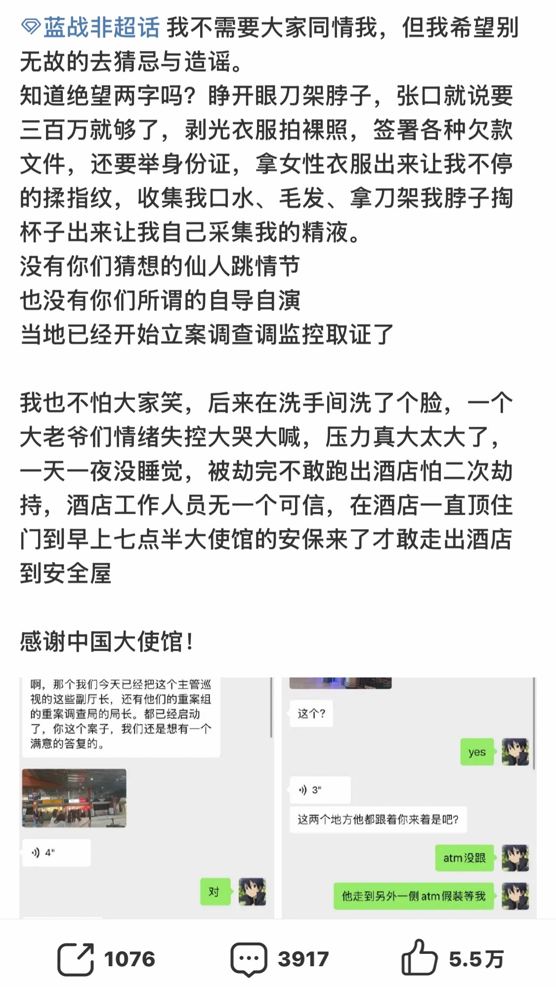 蓝战非称被绑架太可怕了………在绑匪眼中,这就是行走的提款机,说是要300万就够,但据说还是把国内的钱全转干净了,提前半年开始准备,买通机场开通酒店,除了大使馆,无人可信,太绝望了……