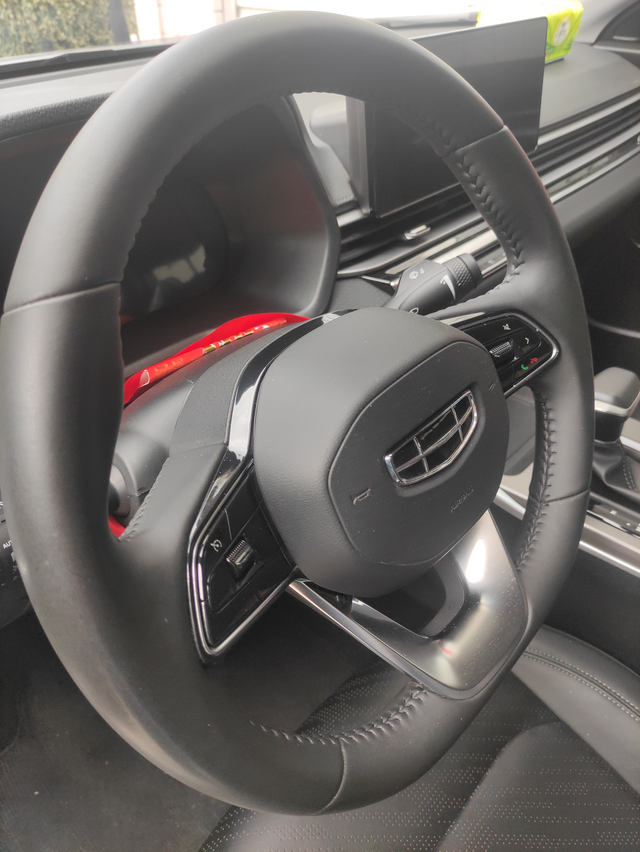 22款帝豪第四代的方向盘 不是很大也不是很传统的那种圆盘。是比较偏向于有运动感的D型方向盘。就我个人而言,方向盘大小正好合适,和车内的中控台、内饰色调是很搭配的