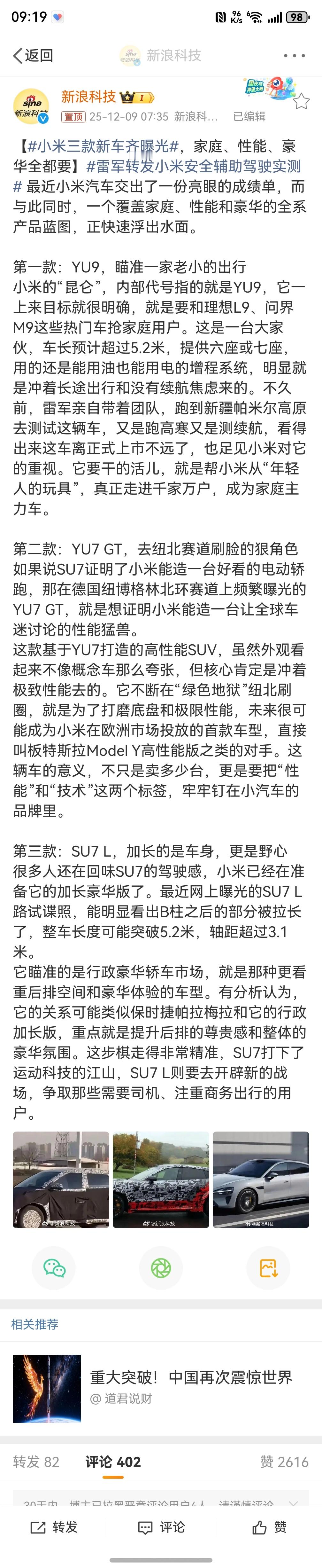 小米三款新车齐曝光 我记得几个月前就曝光了有这些车,小米昆仑增程,SU7L,小米YU7 GT,其实我反而更期待小米SU7 L,30-50万价位的BBA轿车太舒适了,需要给他们上点强度,目前没一家国产厂商能动到这块蛋糕,小米可以吗?还是很期待的