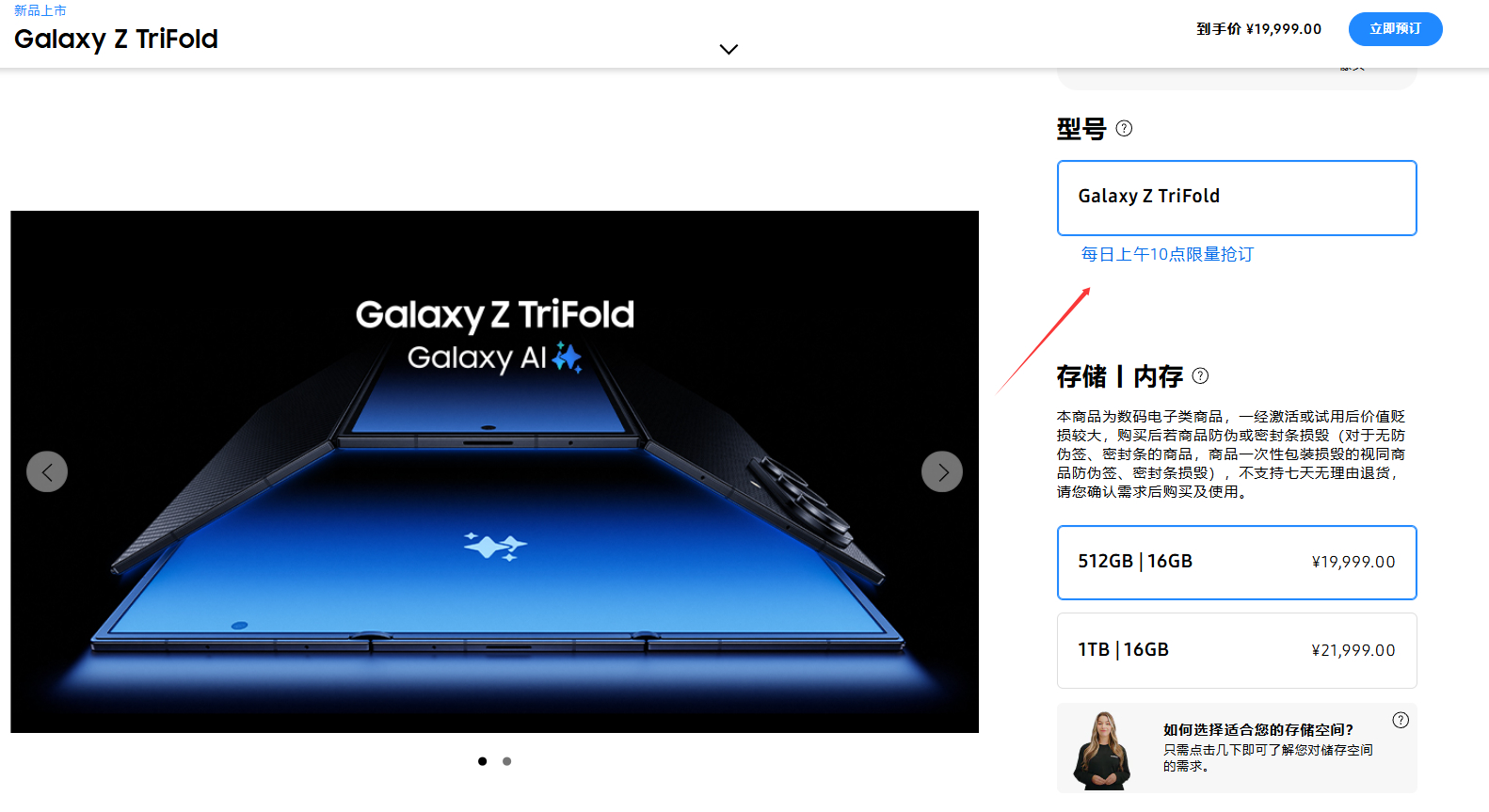三星三折叠Galaxy Z TriFold国行今日开售,售价19999~21999,跟华为的三折叠售价一致,官网还特别批注了:每天上午10点限量抢订,你们抢吗?