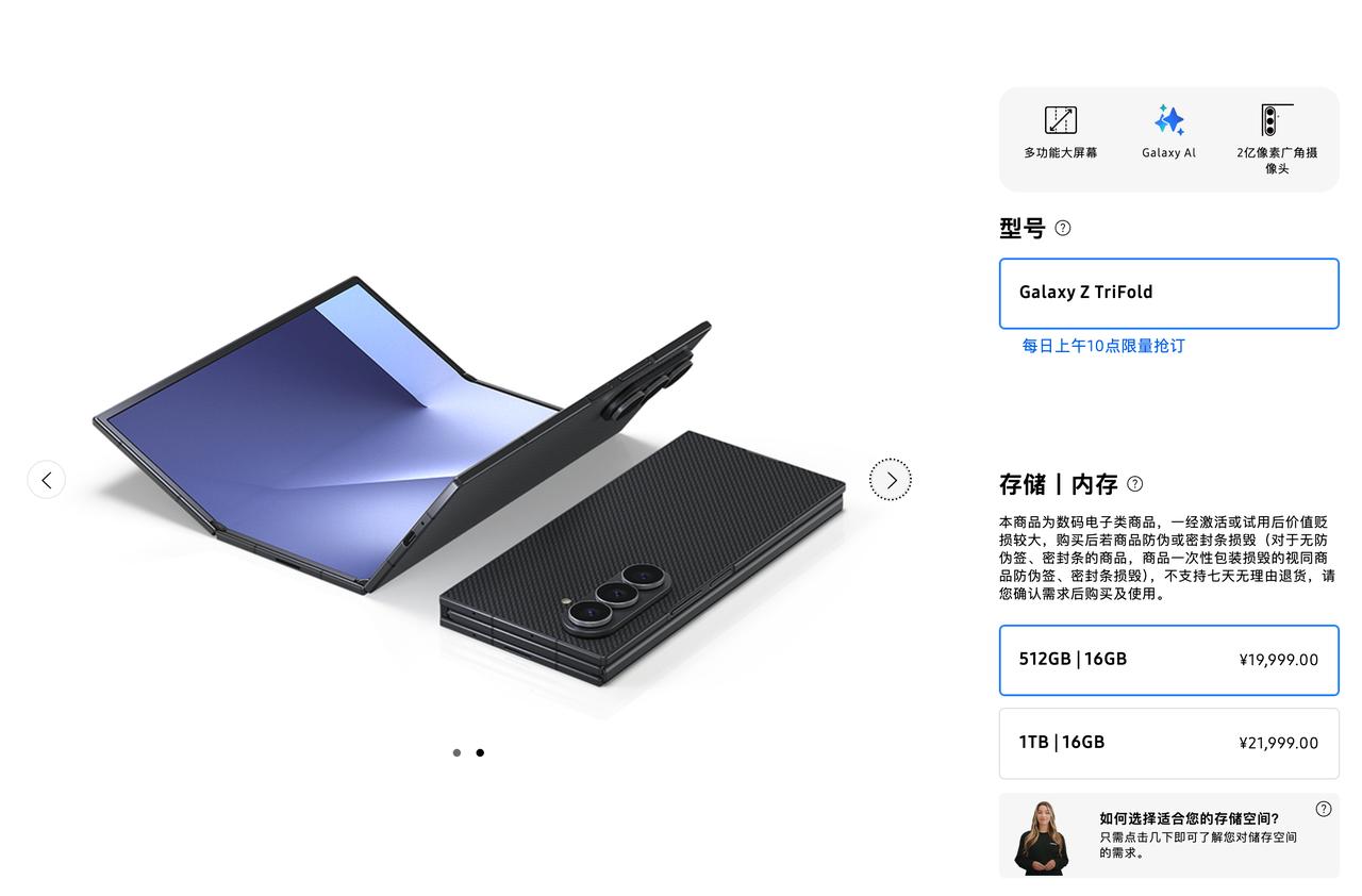 三星 Galaxy Z TriFold 国行价格公布,16+512GB 售价 19999 元、16GB+1TB 售价 21999 元,和华为 Mate XTs 非凡大师相同内存版本的价格一致。明天起,每天 10:00 限量发售。买不买?[吃瓜群众] - 芯片:骁龙 8 至尊版 for Galaxy 处理器; - 内幕:10 英寸 2160×1584 第二代动态 AMOLED 内屏,1-120Hz 自适应刷新率,峰值亮度 1600nits; - 外屏:6.5 英寸 2520×1080 第二代动态 AMOLED 外屏,1-120Hz 自适应刷新率,峰值亮度 2600nits; - 相机:外屏前置 10MP(F2.2,1.12um,85 ̊),内屏前置 10MP(F2.2,1.12um,100 ̊),后置 200MP 主摄(OIS,F1.7,0.6um,85 ̊)+12MP 超广角(F2.2,1.4um,120 ̊)+ 10MP 长焦(OIS,F2.4,1.0um,36 ̊,3X 光变,30X 数码变焦); - 续航:5600mAh 三电芯电池,45W 快充,30 分钟充电 50%,15W 无线快充; - 其他:仅提供时空黑配色,折叠厚 12.9mm,展开带 SIM 卡托一侧厚 3.9mm、中央屏幕厚 4.2mm、带侧边按钮的屏幕厚 4.0mm,重 309g,外屏采用康宁大猩猩玻璃陶瓷 2,后盖采用陶瓷玻璃纤维,钛合金铰链外壳和高级装甲铝框架,侧边指纹识别、蓝牙 5.4、Wi-Fi 7、UWB、USB 3.2 Gen 1、侧边指纹识别,搭载 One UI 8 系统,三星首款支持独立 DeX 桌面模式机型。
