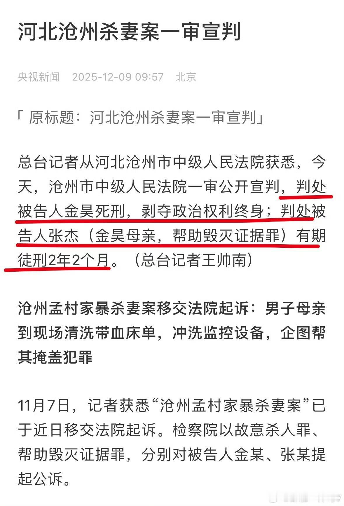 轰动一时的沧州杀妻案终于有结果啦!凶手金昊伏法,其母助毁灭证据难逃刑责,开死亡证明的医生去哪里了? 一审金昊因故意杀人罪被判处死刑,剥夺政治权利终身;张杰因帮助毁灭证据罪获有期徒刑2年2个月。 凶手和他母亲都罪有应得,但我想问的是,当时开死亡证明的医生哪里去了?他难道不需要负担责任吗? 孟村县医院最初出具“心梗死亡”证明,与尸检结果“颅脑损伤致死”严重矛盾,医生是“过失误诊”还是“故意造假”? 从责任来看,分两种情况判定。若是过失导致的误诊,医生会被卫生健康主管部门行政处罚,可能面临警告、罚款,情节严重的还会被暂停甚至吊销执业证书;若是查实是故意出具虚假证明,且是受他人指使或收受利益,目的是帮金昊逃避追责,就可能涉嫌伪证罪或滥用职权罪,届时会面临有期徒刑等刑事处罚。 之所以现在没对该医生采取抓捕措施,是因为警方还在深入核查他和金家是否有关联、出具假证明的具体动机,同时要固定诊疗记录、讯问笔录等核心证据。毕竟刑事案件需严谨,要避免因证据不足出现程序瑕疵,待关键事实查清后,这位医生必然会承担对应的法律责任。
