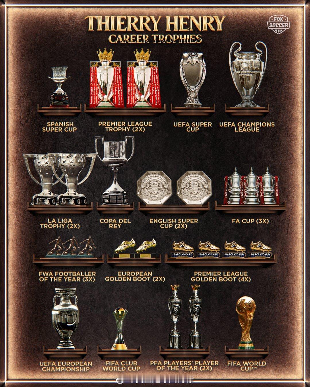 【王者无憾】“枪王”亨利,职业生涯获得冠军和荣誉。英超,西甲,欧冠,世俱杯、欧洲杯、世界杯,还有各种俱乐部杯赛,外加六座金靴奖,非常成功的球员生涯。