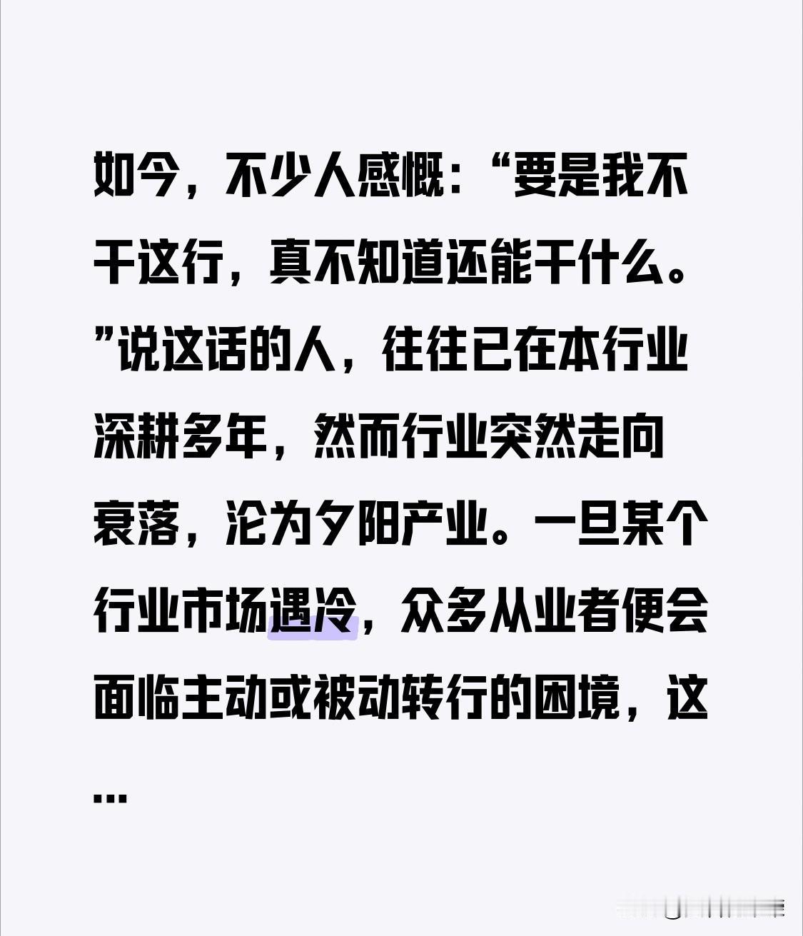如今,不少人感慨:“要是我不干这行,真不知道还能干什么。” 说这话的人,往往已在本行业深耕多年,然而行业突然走向衰落,沦为夕阳产业。 一旦某个行业市场遇冷,众多从业者便会面临主动或被动转行的困境,这着实是个难题。 究竟哪个行业能让人干一辈子呢?除了公务员、事业编、教师、医生等传统行业,新兴的市场行业从业者若要转行,就颇为艰难了。 未来最好行业 未来很吃香行业 行业现状