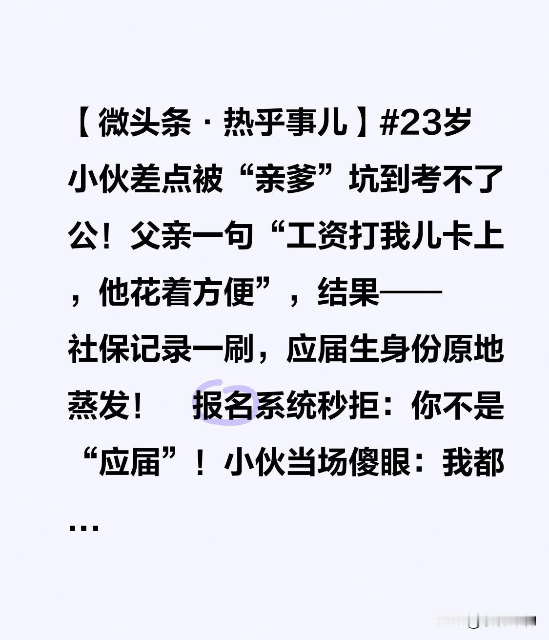 【微头条·热乎事儿】 23岁小伙险些被“亲爹”害得彻底与考公无缘! 父亲一句“工资打我儿卡上,他花着方便”,竟引发了一系列意想不到的后果。 社保记录一查,小伙的应届生身份瞬间灰飞烟灭! 报名系统瞬间拒绝:你不是“应届”! 小伙当场惊得目瞪口呆:我压根儿就没上过班啊?! 紧急时刻,法官火速介入,短短3天,跑公司、调流水、与社保部门据理力争。 最终,一纸判决下达:劳动关系不成立! 卡上那点所谓的“工资”,不过是饱含亲情的生活费。 小伙的应届身份奇迹般地“满血复活”! 结局堪称完美: 小伙笔试成绩一骑绝尘,成功上岸! 老父亲感动得热泪盈眶:以后打生活费一定备注“爱你”。 评论区瞬间炸开了锅,网友们笑翻了天: “这爹确实是亲爹,但这坑挖得也太狠了!” “以后打钱先咨询法官,别再问度娘啦!” 考公避坑指南 应届生身份有多脆