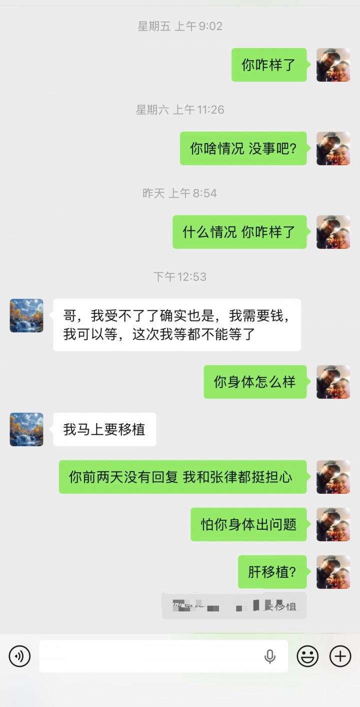 今日李平康再发文,透露此前找他求助向戴琳索要欠款的那位山东泰山球迷近期身体情况极具恶化,需要接受肝移植手术,同时频繁向戴琳索要欠款但却收效甚微,并晒出聊天记录、转账记录、住院费用明细。