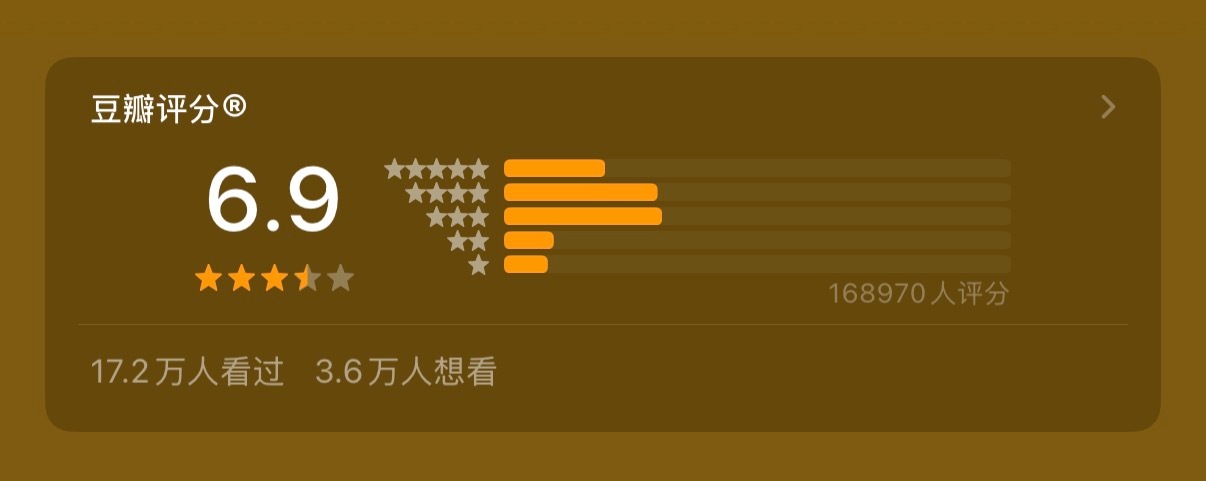 电影《得闲谨制》终于豆瓣开分了6.9分,看这个分型,大部分人都集中在三星、四星、五星上,分布挺均匀的,应该没啥人刷分的吧?