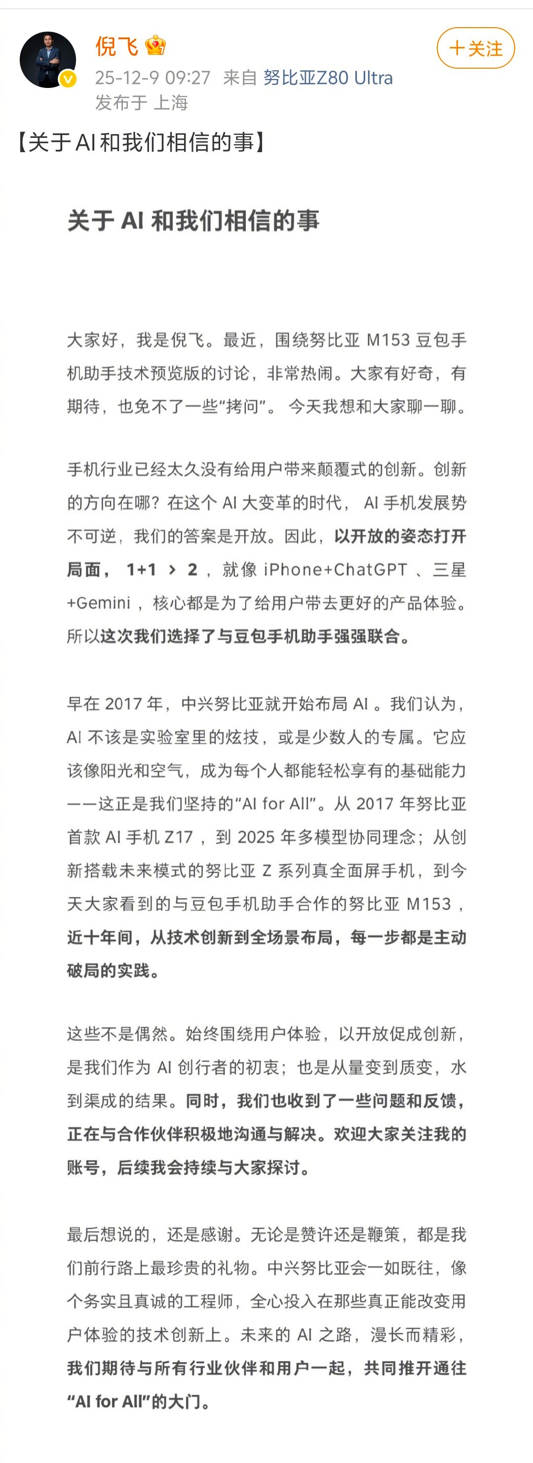 回溯努比亚的AI历程,近十年不是在“破局”就是在“准备破局”:从早期的AI影像算法(比如大家熟悉的NeoVision)到后来的全场景AI生态布局,每一步都围绕用户需求主动出击。而M153豆包助手预览版,正是努比亚践行“AI for All”理念的重要一步——它不再是少数极客的玩物,而是让普通用户也能轻松享受到AI带来的便利:无论是老人用语音控制手机,还是年轻人用助手处理工作琐事,都能感受到“开放创新”带来的温度。努比亚和豆包的合作,打开了行业的新局面,也印证了开放生态才是破局关键。这个手机很有可能成为中国AI行业发展史当中的一个里程碑式的事件!努比亚总裁倪飞回应豆包手机
