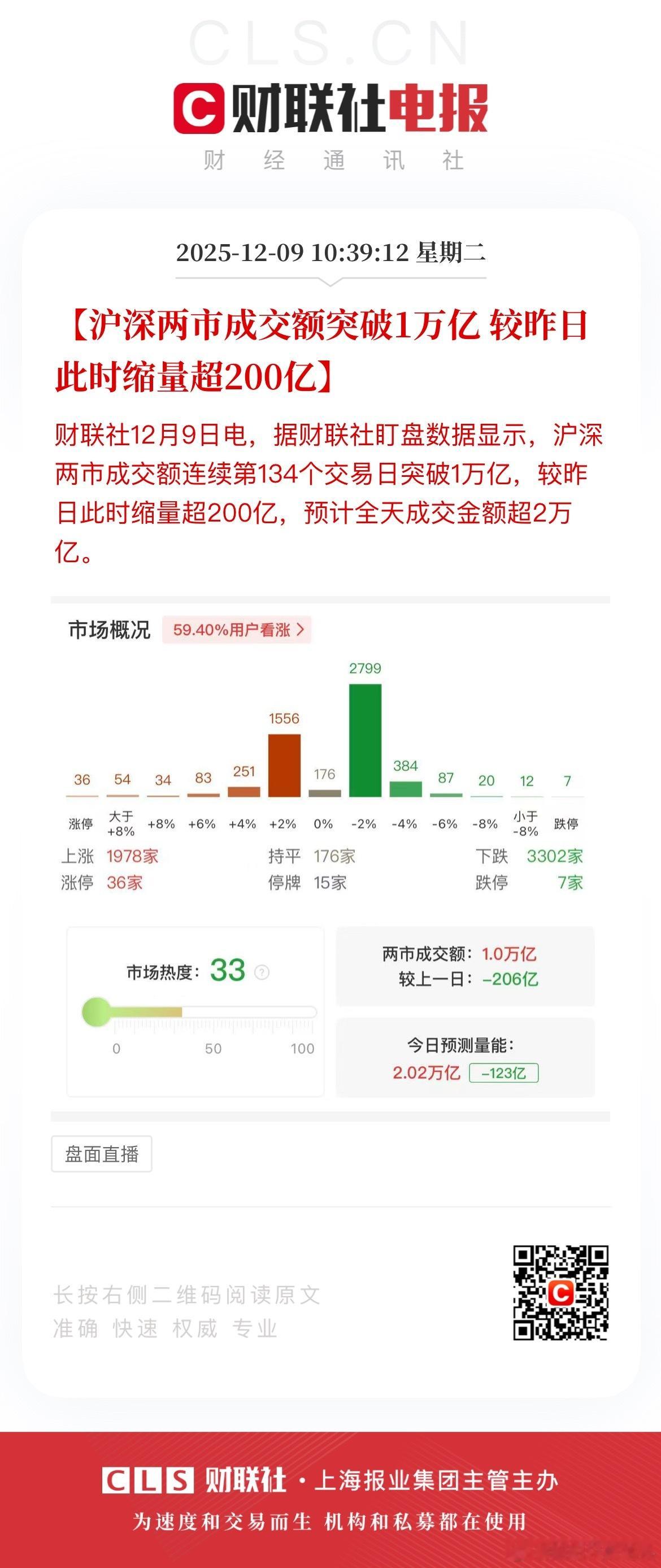 沪深两市成交额突破1万亿较昨日此时缩量超200亿。A股