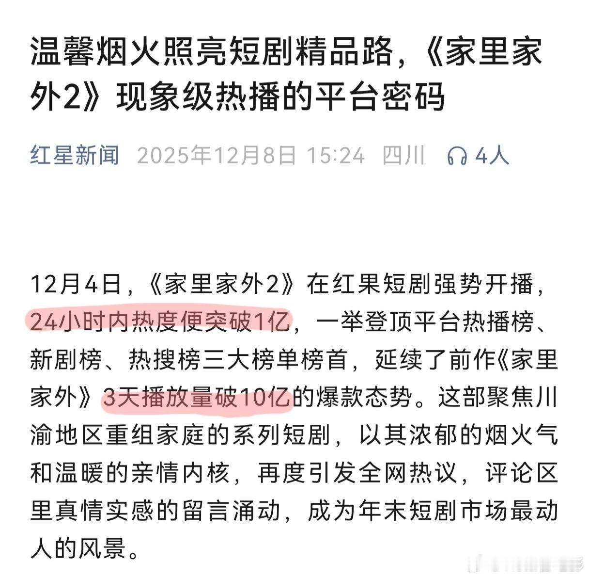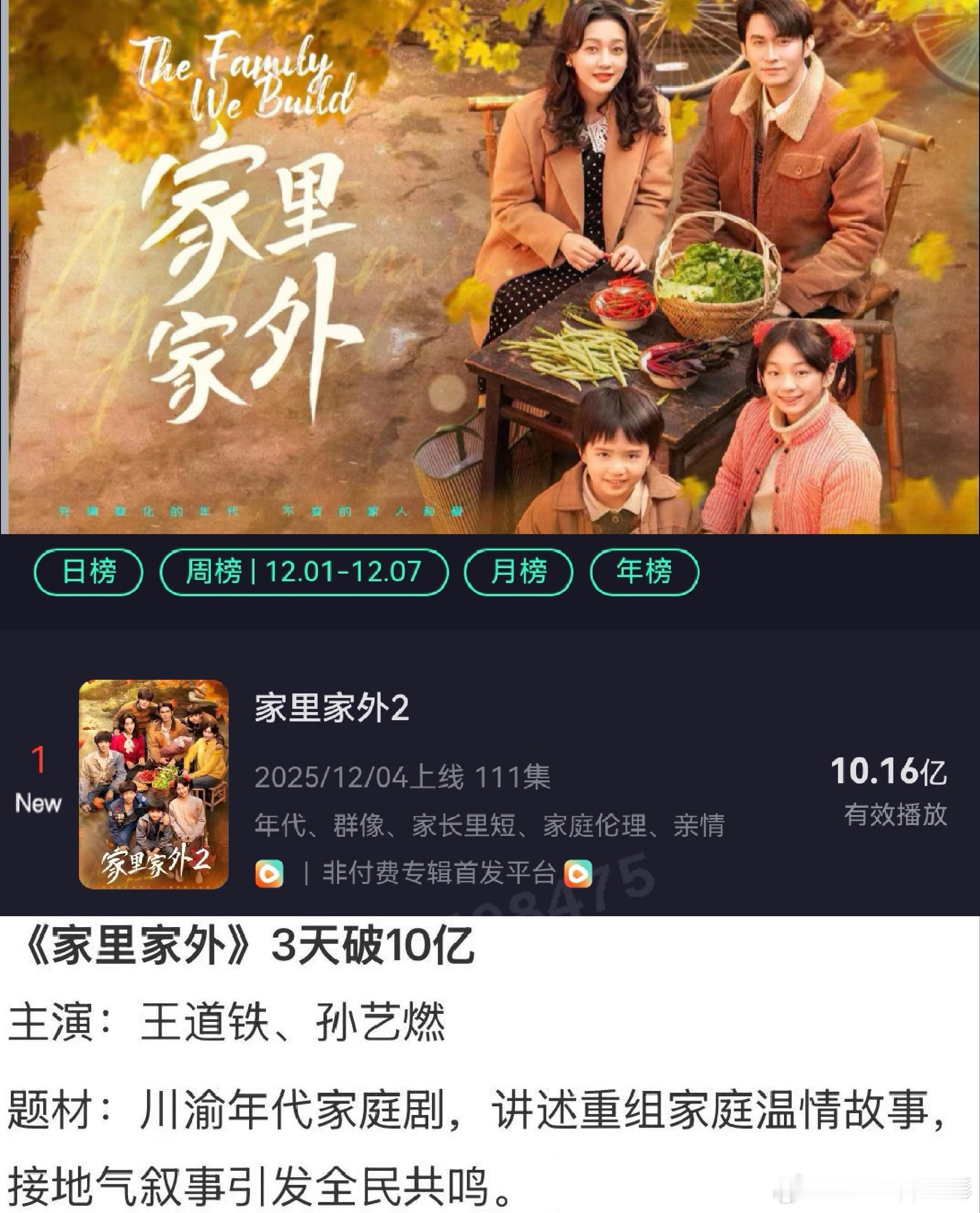 2025年播放量最快破10亿短剧谁被这群像狠狠圈粉!《家里家外2》3天破10亿,泼辣护崽的蔡晓艳、温柔坚韧的陈海清,连配角都鲜活不工具人。周深演唱的主题曲《时间啊》点睛,搭配笑中带泪的剧情,把家庭温情唱进心里。没有悬浮设定,只有真实岁月质感,精品短剧就该这么拍!