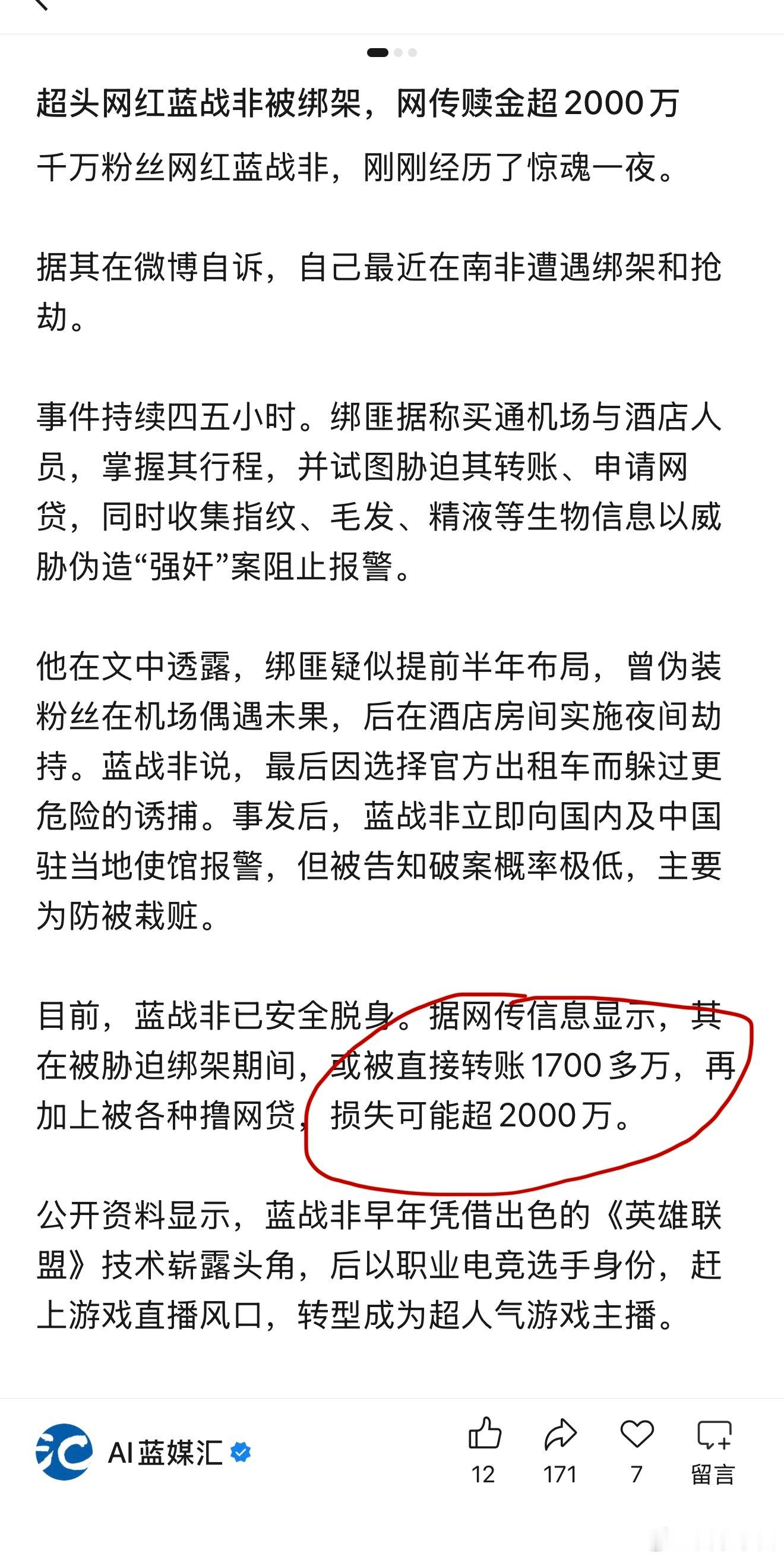 蓝战非被绑架估计是设置了一个比较安全的限额,才有后续的撸,贷。蓝战非好歹十多亿存