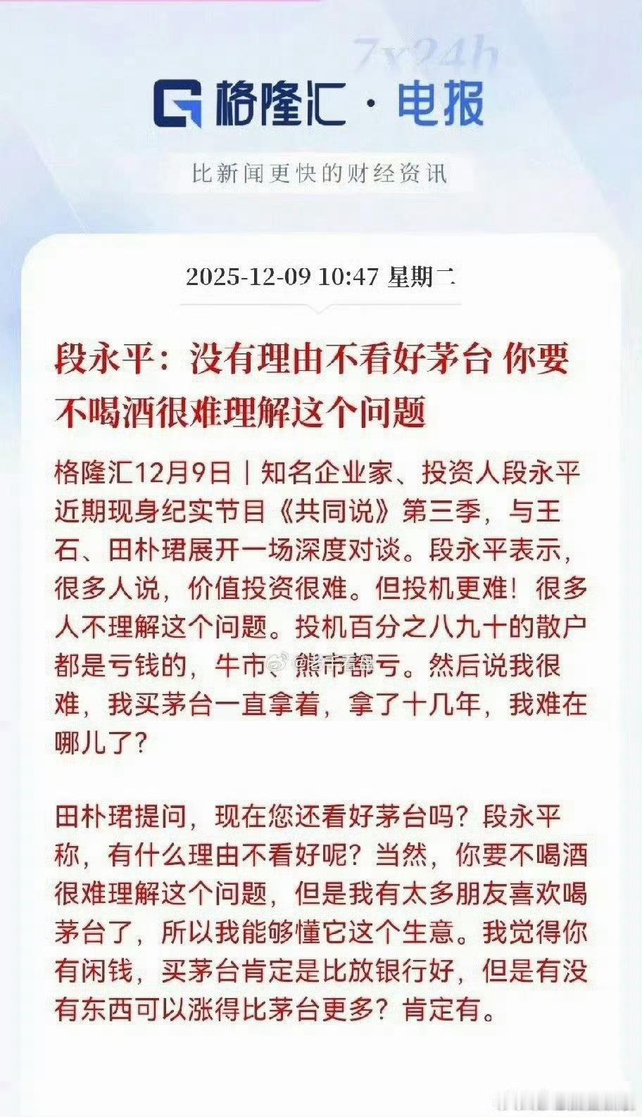 段永平谈看好茅台 段永平现身节目聊投资:看好茅台但不否定其他机会,懂生意才稳,投机多数人亏~