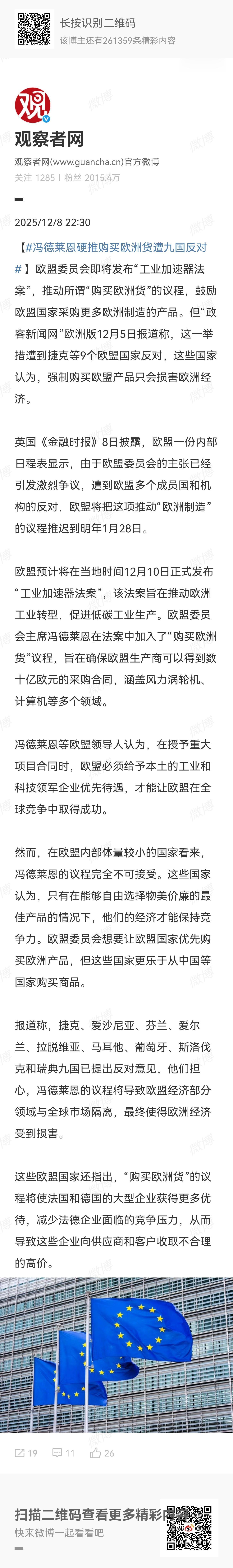 据政客新闻网12月5日报道,冯德莱恩主导的欧盟发布“工业加速器法案”,推动“购买