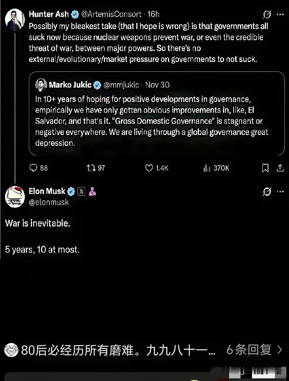 马斯克凌晨3点不睡觉,直接给全世界泼了一盆凉水。 ​​他在网上断言:战争无法避免,就在未来5到10年。 ​​理由很硬, ​全球性的债务危机,和生育率下降, ​这两者在历史上都是引发战争的常见理由。 凌晨三点。大家都睡了。马斯克在网上发了话。像往水里扔了块石头。他说战争躲不掉。就在五到十年里。理由很硬。债务危机。生育率下降。这些在历史上常引发战争。 看看数字吧。美国国债有36万亿美元。每年还的利息听说比军费还高。这数字太大了。像铅块绑在脚上。拖着国家往下沉。 欧洲也一样难受。整体债务占了GDP的85%。德国想省钱。意大利要花钱。内部天天吵。这样的联盟不团结。风雨来了怎么顶? 更缺的是人。乌克兰打了仗。生育率跌到0.9。一个女人生不了一个孩子。整个社会在变老。没有年轻人的地方。未来在哪里? 普京也在愁这个。他说人口下降是俄罗斯“最大危机”。他催地方官想办法多生孩子。他甚至打乌克兰土地的主意。一个感觉自己正在缩小的巨人。它会做什么来发泄不安? 马斯克把两件事放一起。钱的问题。人的问题。他看到了战争的火星子。历史告诉我们。内部压力太大。向外找出口就成了选择。 这不是乱说。国际货币基金组织(IMF)的总裁承认了。他说主导世界八十年的旧秩序正在散架。我们进了“新纪元”。经济分裂的代价越来越大。全球增长预期一次次下调。 蛋糕不大了。甚至变小了。大家抢起来就更狠。美国用《通胀削减法案》补贴自家工厂。欧洲的汽车业就被挖了墙脚。好朋友都这样。何况是早就翻脸的对手? 所以我们看到乌克兰和谈很难。大国天天吵架。背后都是深深的无力感。旧规则快散了。新规矩还没立起来。这段模糊的时间最危险。 马斯克的话像半夜的哨子。他提醒我们。战争的威胁不一定在边境上。它可能就在我们自己社会里。在堆成山的账单里。在安静没有婴儿哭声的医院里。 各位读者你们怎么看?欢迎在评论区讨论。