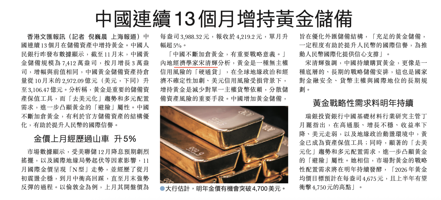宋清辉强调,中国持续购买黄金,更像是一种底层的、长期的战略储备安排,这也是国家对金融安全、货币主权与国际地位的长期规划。详见《香港文汇报》2025年12月8日B1。#经济学家宋清辉#