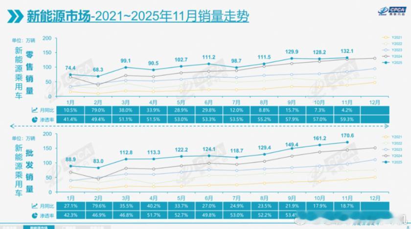 11月新能源零售渗透率接近60%,达到59.3%,也就是说每卖100辆车,就有60辆是新能源汽车,占比越来越高了。