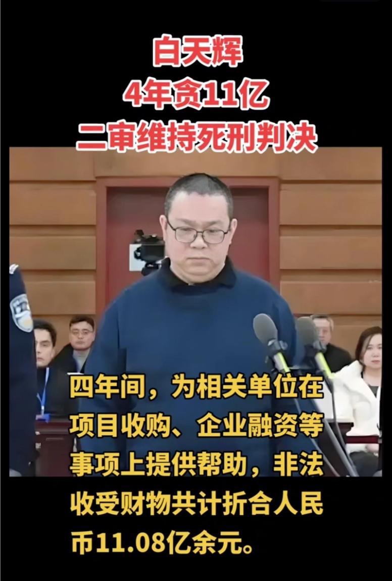 2025年12月9日上午, 经最高人民法院核准, 天津市第二中级人民法院依法对原中国华融国际控股有限公司总经理白天辉执行死刑,其因2014-2018年受贿折合人民币11.08亿余元,且犯罪情节、社会影响及危害均极其严重。 1. 案件判决流程: - 2024年5月28日,天津二中院一审以受贿罪判处白天辉死刑,剥夺政治权利终身,没收个人全部财产。 - 2025年2月24日,天津高院二审驳回其上诉,维持原判并报请最高法核准。 - 2025年12月9日,最高法核准死刑,天津二中院当日执行,临刑前白天辉与近亲属会见。 2. 犯罪事实:2014至2018年,白天辉利用华融(香港)国际、中国华融国际等多个职务便利,为相关单位在项目收购、企业融资上谋利,非法收受财物折合人民币11.08亿余元。 3. 关联背景:白天辉案发与原华融集团董事长赖小民贪腐案相关,是赖小民违法行为的重要帮手,而赖小民已于2021年1月被执行死刑;白天辉虽有重大立功表现,但因受贿罪危害极大,未获从轻处罚。