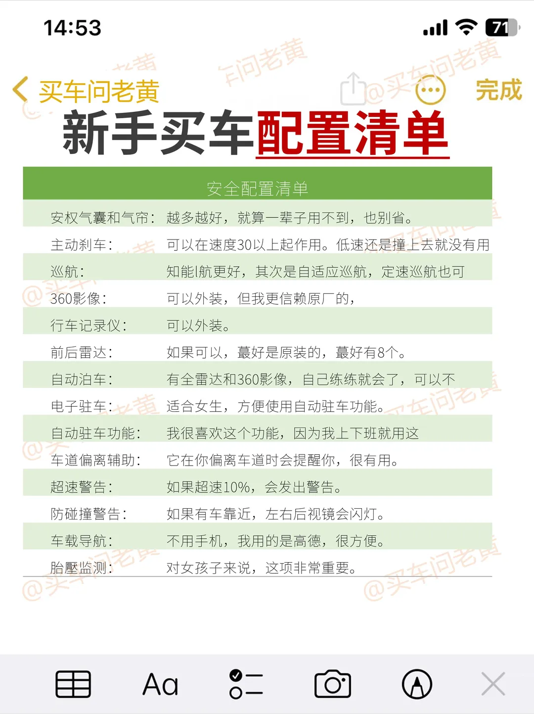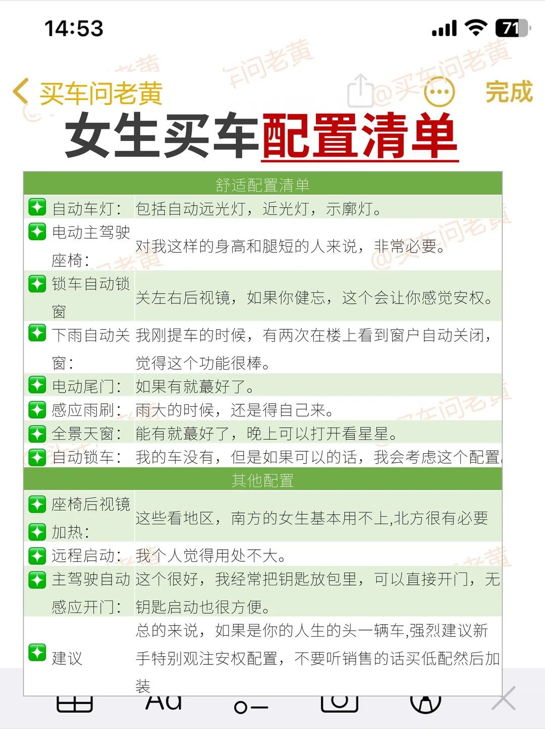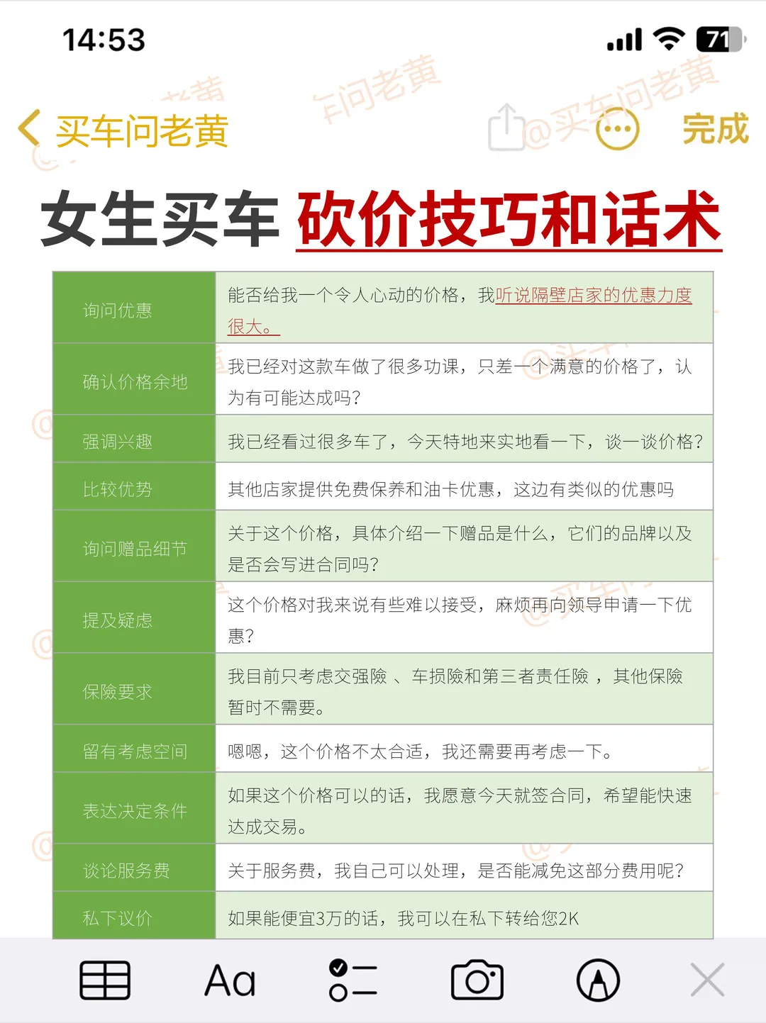 家人们谁懂啊,纯小白,啥也不懂就冲进4S店,结果被销售忽悠得晕头转向,价格没谈下来,还多花好几千,赠品也没要到实用的,小白回家越想越气😭 后来疯狂做功课,总结出超实用买车攻略,分享给姐妹们,一起拒绝当冤大头! 选对时间,轻松拿捏价格 下班前销售急着冲业绩,谈价更容易松口;每周一新一周开始,销售想开好头,领导在旁,价格好商量;季度末和月末,特别是25号后,销售为冲业绩可能大甩卖;新车上市时,老款清库存优惠大,此时捡漏超划算。 砍价技巧,一砍一个准 去之前网上看车主评价,摸清车型优缺点,砍价才有底气。多找几家店比价,邻市也别放过。直接要现金优惠,问清每项费用,别被综合优惠迷惑。销售不好谈就找领导,领导权限大。分期裸车价可能低,但全款也能用这个价谈。谈得差不多假装犹豫,销售可能再给优惠。 费用精打细算 购置税用裸车价除以11.3算,别被低开价格影响保险。上牌费就几百块,有的店还全免。车价低的话,服务费可适当给,但要问清楚,拒绝乱收费。 赠品要实用 加油卡、保养券(问清含不含工时费、机油种类)、行车记录仪、贴膜、脚垫实用,别要华而不实的摆件。 车险这样买 三责险、交强险、车损险必买。医外保、驾乘险建议买,多一份保障多一份安心,意外来临时能减少损失。 签合同要仔细 订金可退,定金不可退,一定要写清楚。合同注明车型、颜色、配置、赠品、利息、月供、提车时间、违约补偿等细节。库存车(国产超3个月,进口超6个月)、运损车、事故车、泡水车、火烧车坚决不要,质量没保障,维修成本高。 验车别马虎 洗完车在光线好处检查车漆有无划痕。核对轮胎、玻璃生产日期,别差太远。新车公里数应在50内,座椅无划痕,功能正常。摸摸门窗等胶条,检查密封性。 家人们,按这攻略买车,不迷路、省钱又省心,赶紧收藏,买车时用得上💖 ✅图2 "新手买车如何砍价" ✅图3 "女生买车 砍价技巧和话术" ✅图4"新手砍价千万别说这些话" ✅图5"买车签合同 如何避坑" ✅图6 "女生买车配置清单" ✅图7"新手买车配置清单" 如里您觉得有用,请👍➕🌟, 买车一定用的上!主页更多汽车知识~ ✔️✔️✔️✔️✔️✔️✔️✔️✔️✔️ 老黄从事汽车行业10多年 买车用车关🐷老黄: 購车全程指导 买车避坑 给底价 用车技巧