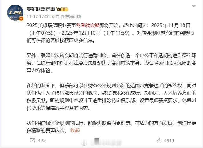 还要憋气多久❓2025LPL冬季转会期将在明天中午关闭转会市场目前LPL赛区在RA/FPX相继退出联盟之后还剩15支队伍,RNG也有很大可能不参加2026赛季的比赛;而今年冬转即将结束,还有多支俱乐部没有官宣他们的人员变动公告。2025LPLLPL冬季转会期关窗在即英雄联盟S15
