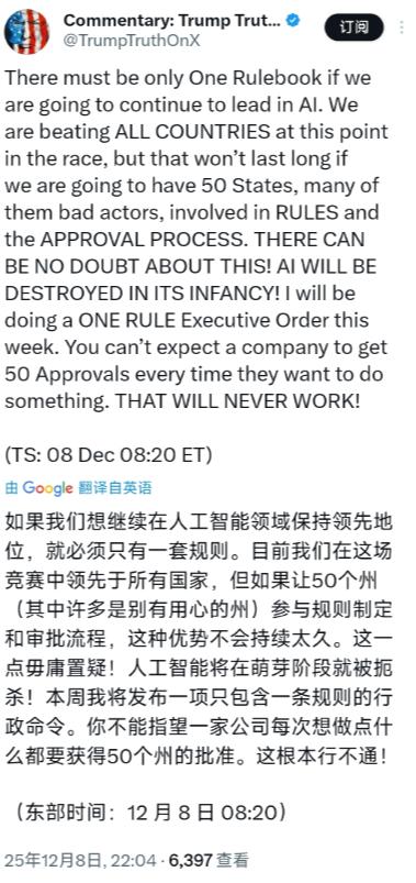 美国总统特朗普12月8日晚发文写道:“如果我们想继续在人工智能领域保持领先地位,就必须只有一套规则。 现在我们是领先所有国家,但要是让50个州——好多还是别有用心的州——各自搞规则、搞审批,这点优势撑不了多久。”这话里的火药味不用细品都能闻出来,本质上是特朗普在替美国AI产业喊“停”,叫停眼下各州各自为政的监管乱象。 特朗普这话不是空穴来风,更不是单纯的政治表态,而是戳中了美国AI发展的真痛点。现在的美国AI圈,表面上风光无限,OpenAI、谷歌这些巨头握着最先进的技术,可背后的监管早就乱成了一锅粥。 联邦政府这边一直没拿出个像样的统一框架,用美联社的话说就是“几乎处于停滞状态”,逼得各州只能自己动手填补空白,加州就是最典型的例子。 今年10月,加州州长纽森直接签署了人工智能安全法案,把联邦政府没干的活给干了。法案里写得明明白白,要求AI公司公开安全协议,防止技术被用来造生物武器、攻击银行系统这些要命的事,一旦出了重大安全事故15天内必须上报,违规一次就罚100万美元。 纽森签法案的时候还不忘挤兑联邦政府,说国家连个统一框架都没有,再不监管风险就失控了。加州一带头,其他州也跟着动起来,可问题是各州的心思根本不一样。 有的州跟加州似的,把安全和隐私看得比啥都重,规则定得严丝合缝;有的州比如得州,满脑子都是怎么吸引AI企业投资,规则往宽松了搞,就怕吓走金主。 这么一来,美国AI企业就遭了罪,一套技术要适配十几个州的不同要求,光合规成本就得拖垮半条命。OpenAI的CEO奥特曼之前在国会听证会上就警告过,这种分散监管搞不好会对美国的领先地位造成“灾难性影响”,他甚至说美国领先中国的时间“不会太长”,这话正好戳中了特朗普的痛点。 作为一直把“美国优先”挂在嘴边的人,特朗普对AI领域的领先权看得比谁都重。他这两年没少在AI上发力,先是搞了个“创世纪任务”,号称要集结联邦科学资源搞AI研究,堪比当年的阿波罗计划。 又签过行政令阻止所谓“觉醒”式AI,要求联邦政府只买“不带偏见”的模型。这些动作核心就一个:把AI发展的主动权攥在联邦手里,不能让各州瞎捣乱。 这次特朗普炮轰“别有用心的州”,其实是把之前的矛盾挑明了。他心里很清楚,现在全球AI竞赛拼的就是效率,中国、欧盟都在往前赶,欧盟已经有了统一的《人工智能法案》,中国的监管框架也在逐步完善,美国要是还在内部互相消耗,迟早被超过。 而且他说的“一套规则”,不光是为了企业省事,更是想把监管权收归联邦,方便统筹资源——毕竟他推动的“创世纪任务”还等着整合全国的科学数据和计算资源,各州各自为政,这个计划根本推不动。 特朗普的言论一出来,科技圈和政界的反应立马分成了两派。AI巨头们大多是举双手赞成的,微软、AMD这些公司的高管早就呼吁过要减少监管障碍,统一规则对他们来说就是减负。 但各州那边不乐意了,有州议员直接反驳,说各州情况不一样,联邦搞“一刀切”根本不切实际,纽森之前就明着批评联邦政府“无所作为”,现在自然不会轻易让步。 还有批评者说,特朗普这是在帮科技巨头站台,把国家数据和资源都交给企业,说白了就是“把美国和AI卖给了大公司”。其实特朗普的担忧不是没有道理,可想要把50个州的规则拧成一股绳,难度堪比登天。 之前共和党议员试过推动“十年内禁止各州自行监管AI”,结果连国会都没通过。现在他喊出“一套规则”的口号,本质上是想借着舆论给联邦政府和各州施压,逼大家坐到谈判桌前。 毕竟对美国AI产业来说,现在最耗不起的就是内耗——就像奥特曼说的,领先的优势本来就没那么大,再这么折腾下去,真有可能被别人追上了。 至于特朗普的话能不能管用,现在还不好说。但有一点很明确,美国AI领域“联邦缺位、各州补位”的混乱局面,迟早得有个了断。要么像特朗普说的那样拧成一股绳,要么就接着内耗直到优势耗尽——这道选择题,美国政坛和科技圈都躲不过去。