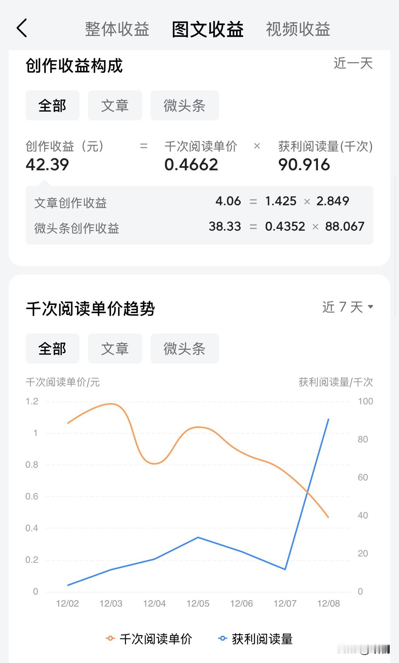 太夸张了,9w多的阅读量,收益竟然只有4块多? 因为昨天阅读量是比较多的,我以为今天收益的话也会比较可观,然后打开头条看了一下,竟然只有四块多,当时人都蒙了 我甚至都以为平台计算错误了,后面才发现那里显示更新中,它不是准确的,后面我再重复刷新了几次才把收益完整的体现出来了 之前都没有出现过这种情况,以前那里数据出来了,基本上都不会改变,现在才知道原来后面他还会有数据的起伏,这确实是让我没想到 收益,更新出来,总共的话也是只有四十多,说实话还是挺失望的吧,毕竟他这个单价确实是太低了,我一开始以为最少他那个单价都会在0.7左右,没想到比我预料的还要低很多 因为我看素老三,苗晶晶这几位她们的单价好像都比较高,不知道是出于什么原因 所以说,我们这普通人还是研究不透平台这个算法,只能说尽量去更新吧,后面具体怎么样?留给时间去验证吧。 主要自己来头条创作的时间也不长,能做到这种情况也算是比较满意了,后面争取能更好一些 平台这个收益的算法具体是怎么样的?有没有知道的朋友可以在评论区讨论一下
