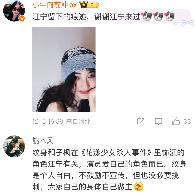 12月8日,张子枫纹纹身上热搜! 第一个发现这件事的人简直是眼力惊人! 不仔细看根本发现不了的一个小小小小纹身,看到网友说公众人物纹纹身不好,对张子枫的好感本来就因为她跟焉栩嘉恋爱下降了,如今又降了,还看到有网友说纹纹身会上瘾,在线劝张子枫不要再纹了! 我想说,首先这属于个人自由,其次以后不要再展示在镜头里了,最后随她吧! 虽然一直喊子枫妹妹,但她年纪也不小了,无论是谈恋爱,还是做什么都是自己能承担结果的,旁人不用过于计较。