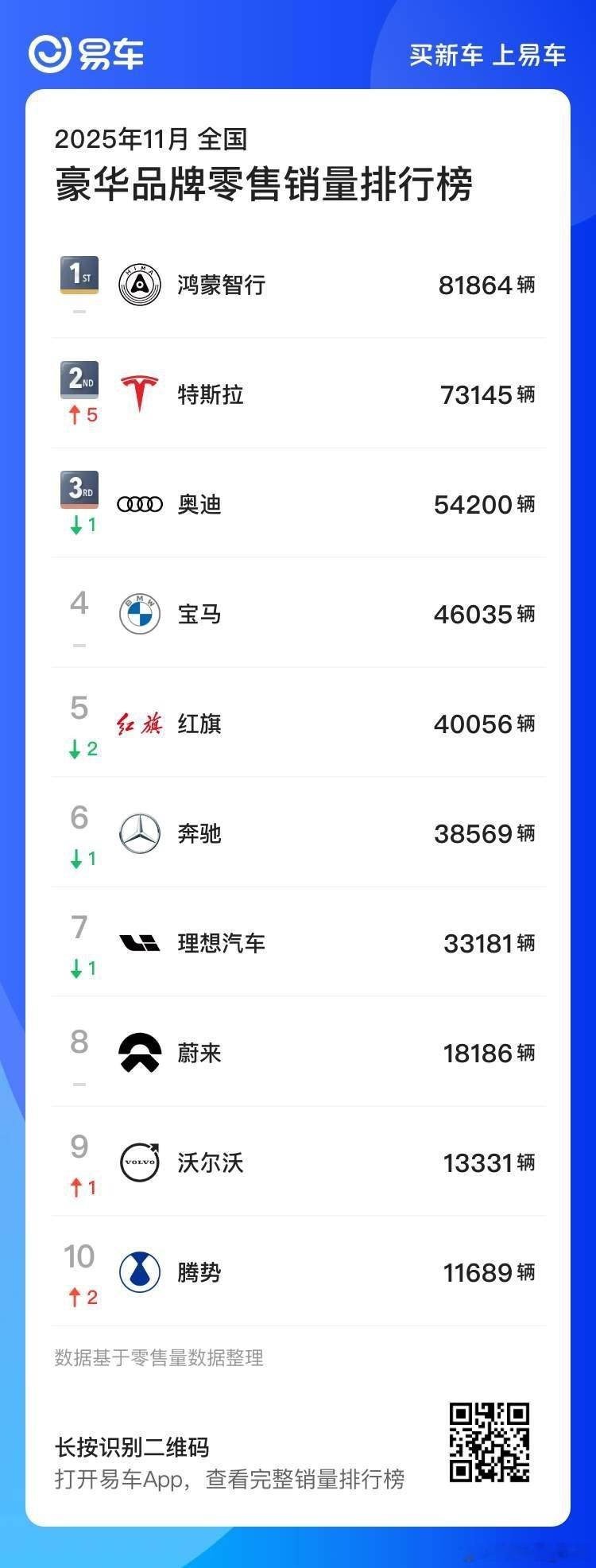 11月 豪华品牌榜:- 鸿蒙智行,超越特斯拉排名第一- 单看问界(51,706台