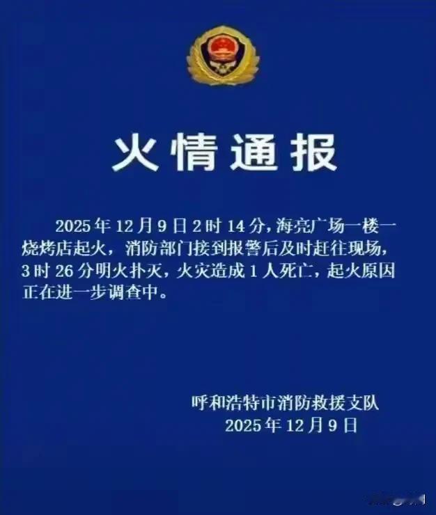 呼和浩特12月9日一烧烤凌晨起火致1人死亡。