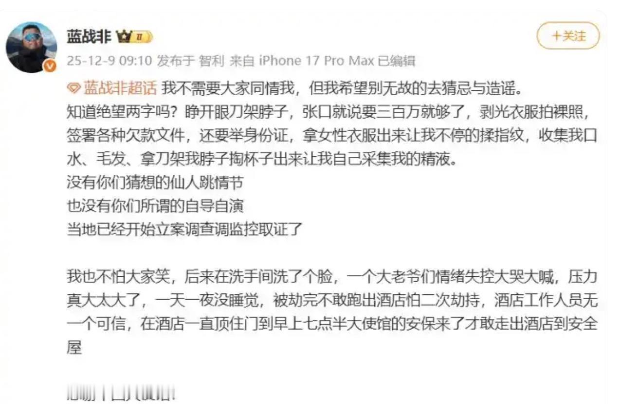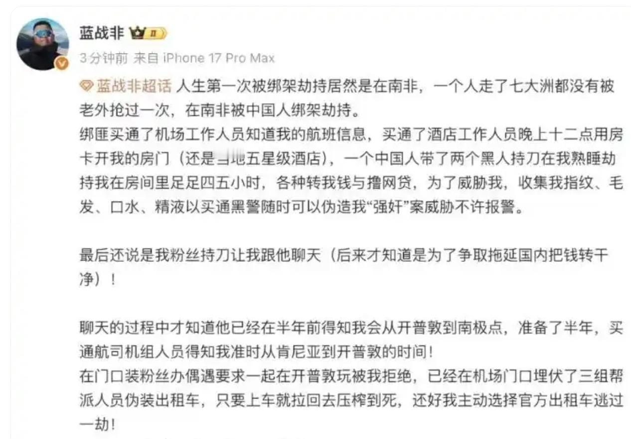 全网坐拥3000多万粉丝的博主蓝战非,他在南非旅游的时候遭遇到了绑架劫持,而背后策划这起绑架案的不是别人,正是国人好同胞! 据蓝战非自己讲述,对方老早就盯上了他,在半年前就开始了策划。他们买通机场的工作人员,得知了蓝战非的航班信息。之后他们就开始了一系列的策划,先是假装成粉丝与蓝战非偶遇,邀请他去开普敦玩。之后又排了三组人,伪装成出租车接人。 在失败之后又尾随蓝战非去了酒店,买通了酒店工作人员之后,在晚上12点之后用房卡开了门,之后对方带着2名黑人,用刀挟持了蓝战非,开口就问他要300万美金。随后在接下来的四五个小时内,就开始了让蓝战非疯狂转钱撸网贷。而且为了防止蓝战非报案,还特意采集他的生物信息,来威胁他。 好在的是这伙绑匪,总算是有点底线,他们是只要钱不要命,否则的话蓝战非绝对是凶多吉少。事实上这已经不是第一次,中国的博主在外国被绑架了,而且无一例外绑架案的背后,都是有国人的身影,包括罗大美案,背后的凶手也不是外人。 这些博主为何会被绑架啊,无非是因为他们有钱而且高调,蓝战非一条1分钟的广告,报价就在150万,更不用说其他的收入了。所以他们就被别有用心之人给盯上了。在国内的时候,因为治安很好,所以他们没有下手的机会,可到了国外之后,尤其是一些落后的地区,治安不太好,管理也很混乱,所以就给了这些人可乘之机。 而且这些发生在国外的绑架案,除非是关注度特别高的,否则的话大多数是无疾而终,家人连讨个说法都讨不到。咱们老祖宗深谙这个道理,所以就有了“财不外露,贵不独行,富不显相”的劝告。可即使到了今天,仍旧有人不放在心上,所以才栽了一个又一个跟头。栽跟头其实不可怕,大不了重来就行了,怕的是你连重来的机会都没有。