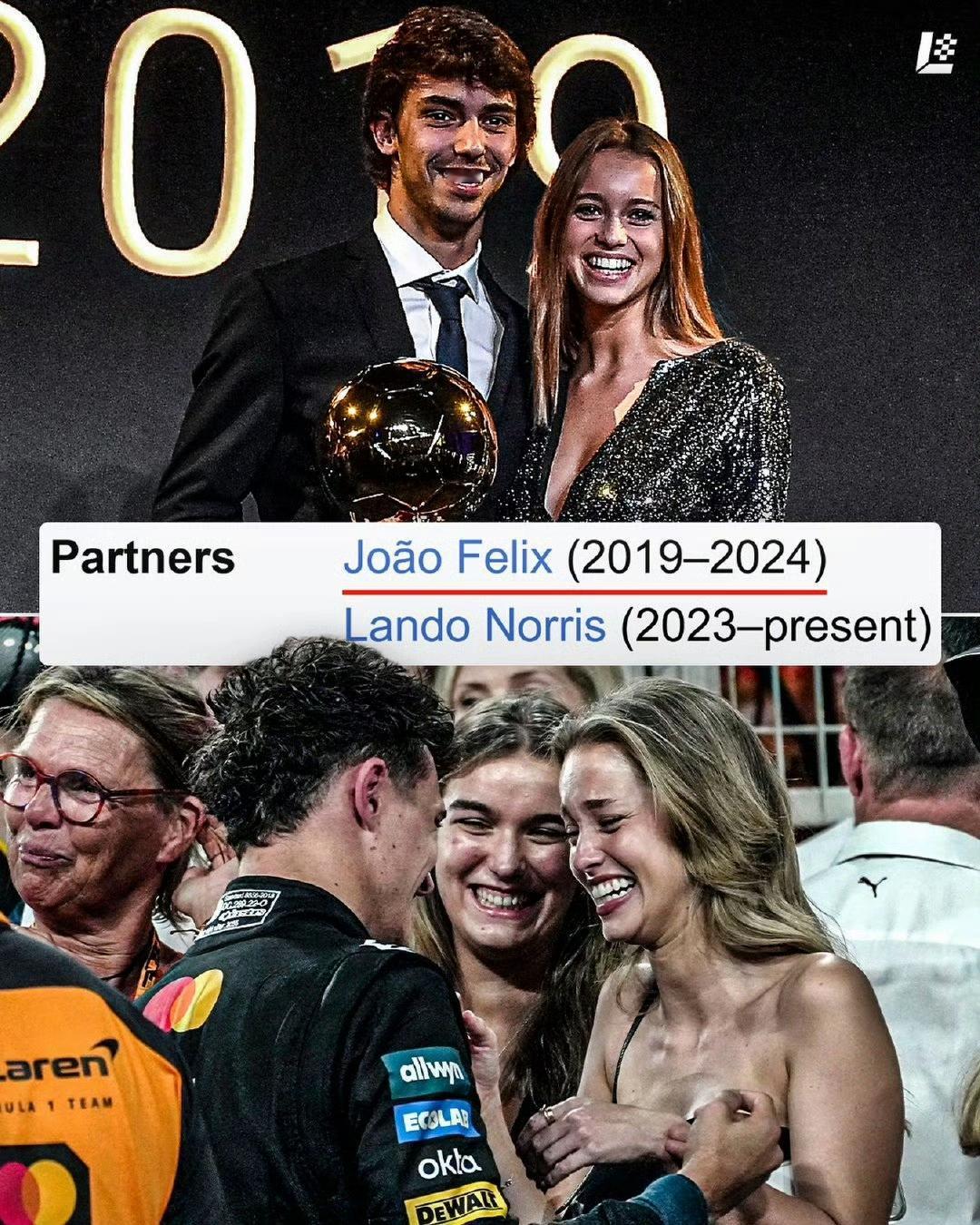 她才是人生大赢家,每次都赶上了最好的时候…… 玛格丽达·科塞罗IG晒跟诺里斯亲密合影宣示主权,配文:我的小小世界冠军😭 2019年她陪伴菲利克斯上台领取欧洲金童奖。 2025年她陪伴诺里斯收获F1车手总冠军,在阿布扎比出尽风头。