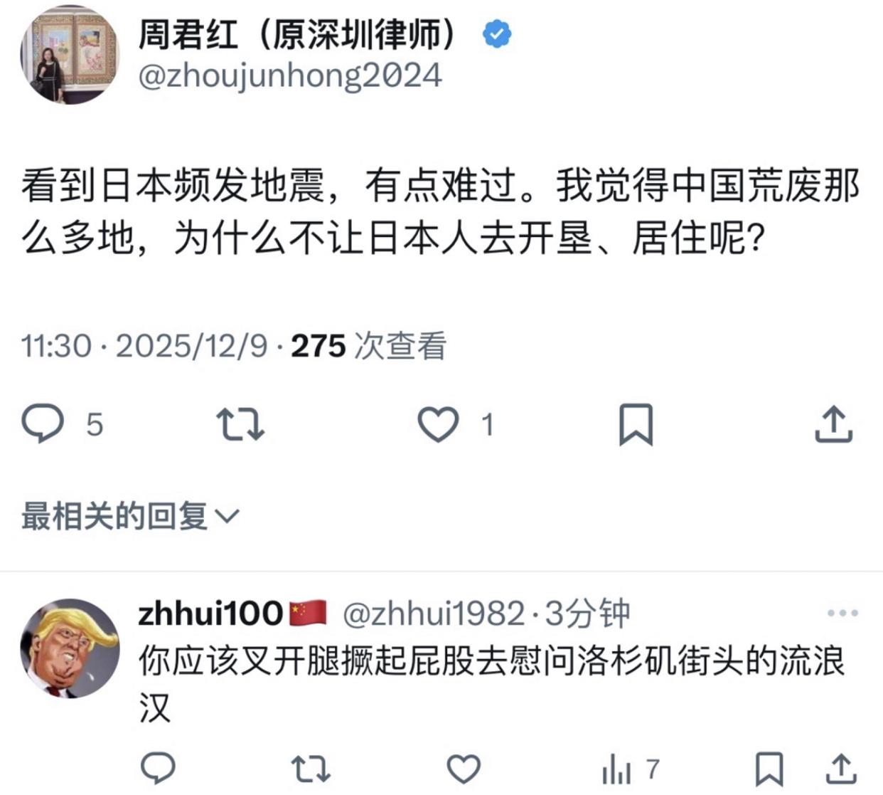 润到美国的华人女子发文表示:她看到日本地震频发,有点难过,同情起日本人来,她觉得中国有那么多土地荒废,为什么不让日本人去开垦居住呢? 中国的土地是属于全体中国人的,没有一份土地是多余,哪怕是沙漠,也不会允许日本人染指。