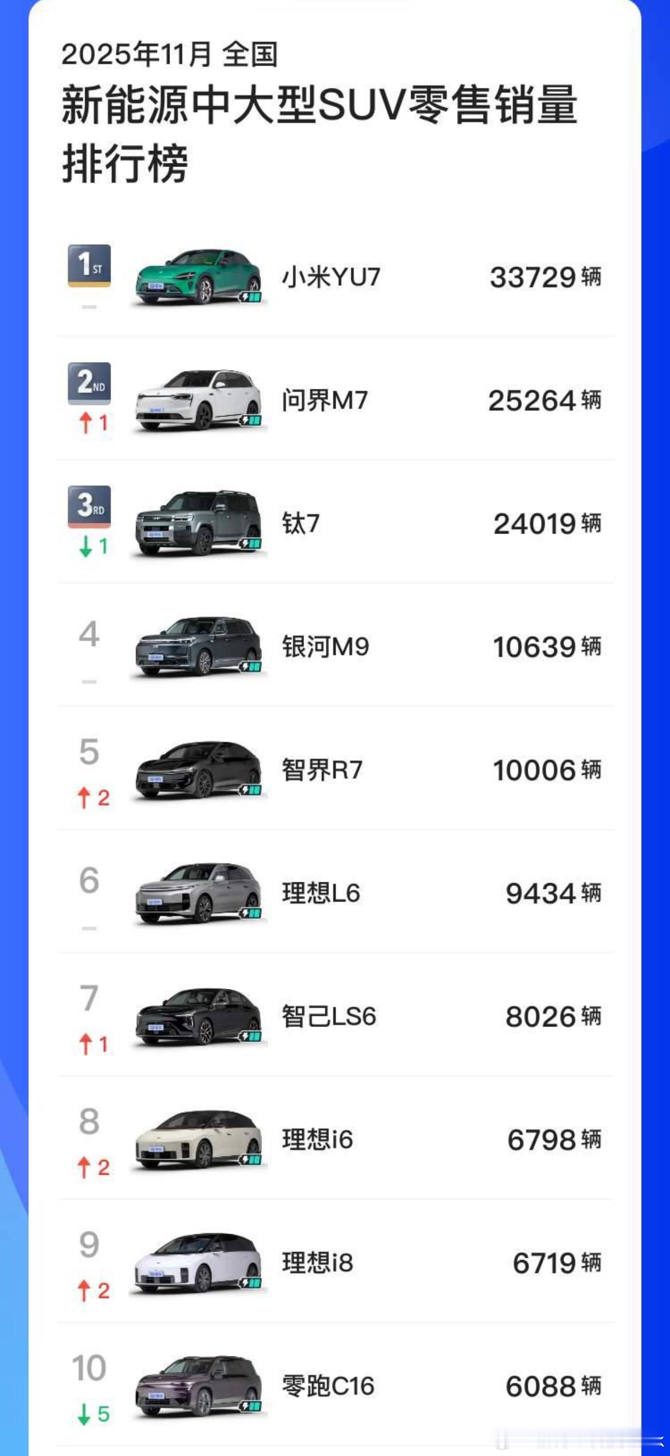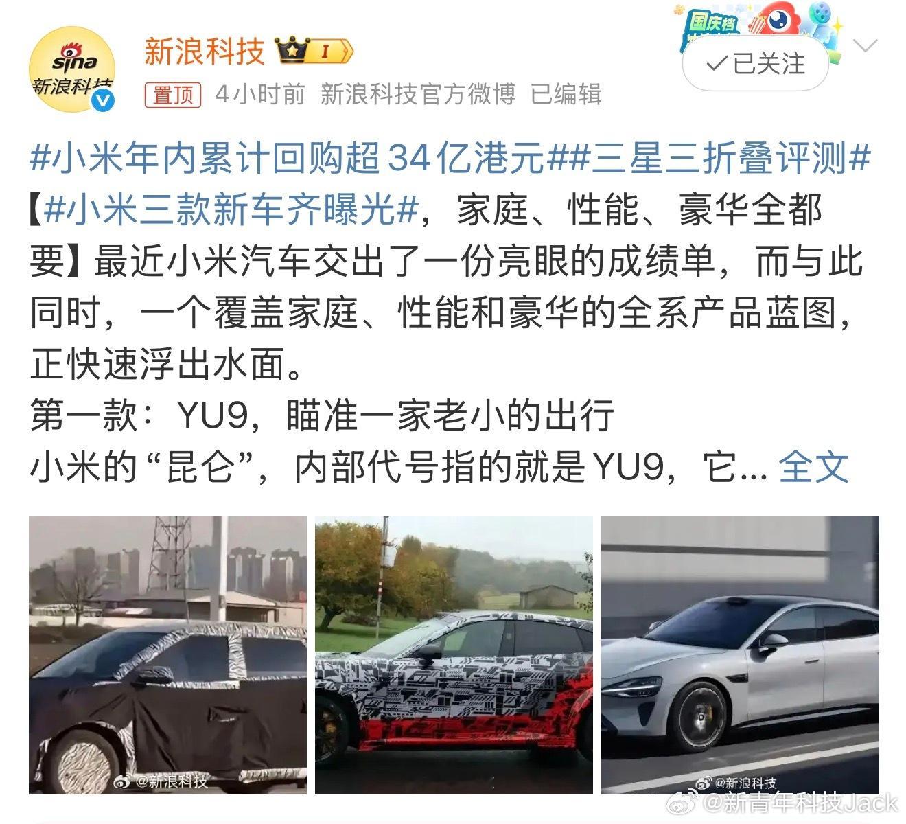 小米三款新车齐曝光 今天关于小米三款新车的消息也越传越多了, 先来看看11月成绩单!YU7超3万台,直接拿下无定语前十,SUV前列。官方低调只说总交付量超4万台,但实际上46349台,藏着6000多台没说也是没谁了!小米SU7也是在这一年里拿下不分能源类型的20万以上第一。不过说实话,看着网传的后续产品规划确实定位很清晰啊!小米YU9定位6座/7座大型SUV,主打全家长途出行。小米SU7 L行政级轿车,车长或将超过5.2米,后排空间和内饰有升级?小米YU7 GT,主打高性能SUV,在纽北测试中,估计也快有好消息了。从各家海外媒体和各路高管的真实评价和一些拆车媒体的视频中可以发现,小米汽车的配置和用料以及驾控智能化都是可以被实打实看见的真实力,小米十倍投入造车的决心和成绩是爆款频出的原因之一。