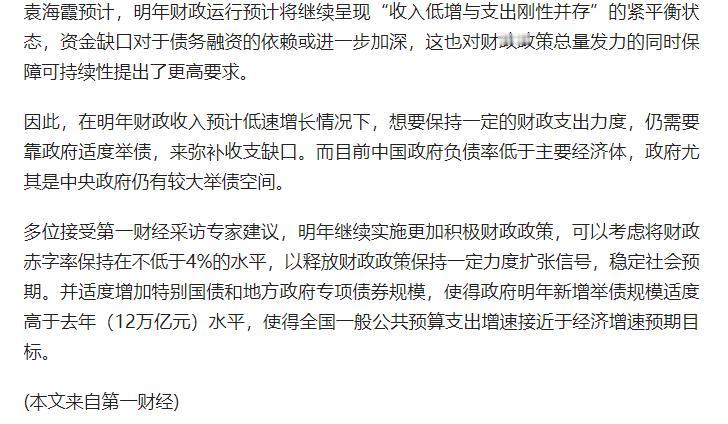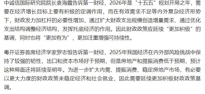 中央再次定调明年继续实施更加积极财政政策,也符合市场预期。 原文来自:第一财经《中央定调明年财政政策:继续“更加积极”》