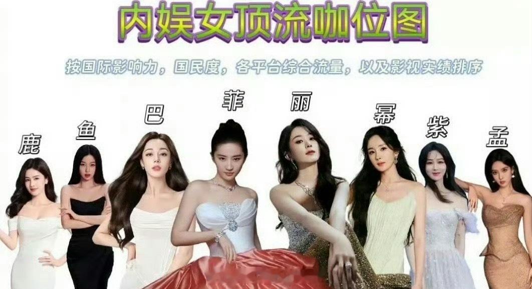 内娱女顶流梯队,你认同吗?85花:赵丽颖、刘亦菲、杨幂、刘诗诗、倪妮、唐嫣、张小斐、辛芷蕾90花:杨紫、迪丽热巴、周冬雨、李沁、金晨、白鹿、鞠婧祎95花:赵露思、虞书欣、周也、田曦薇、张婧仪、卢昱晓、孟子义、李兰迪