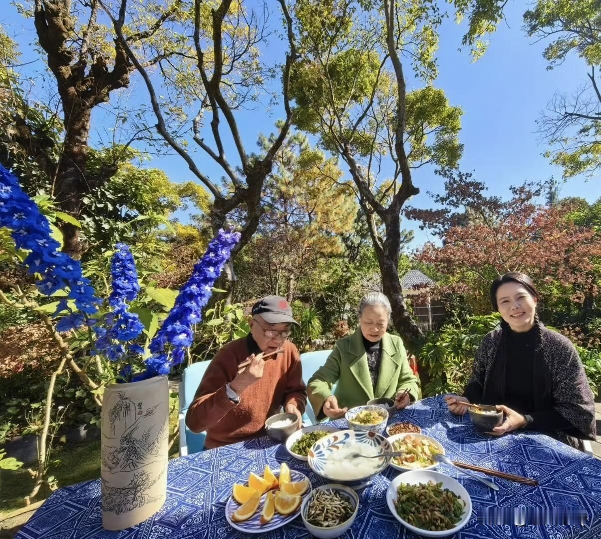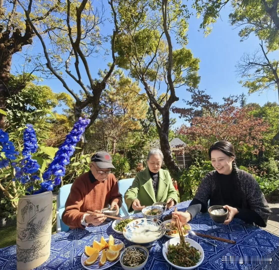 龚琳娜陪二老吃饭,冲这个就餐环境也太舒服了。小院清幽雅致,阳光透过枝叶洒落斑驳光影,这温馨家宴平添几分诗意。