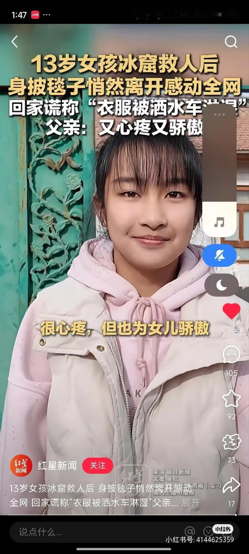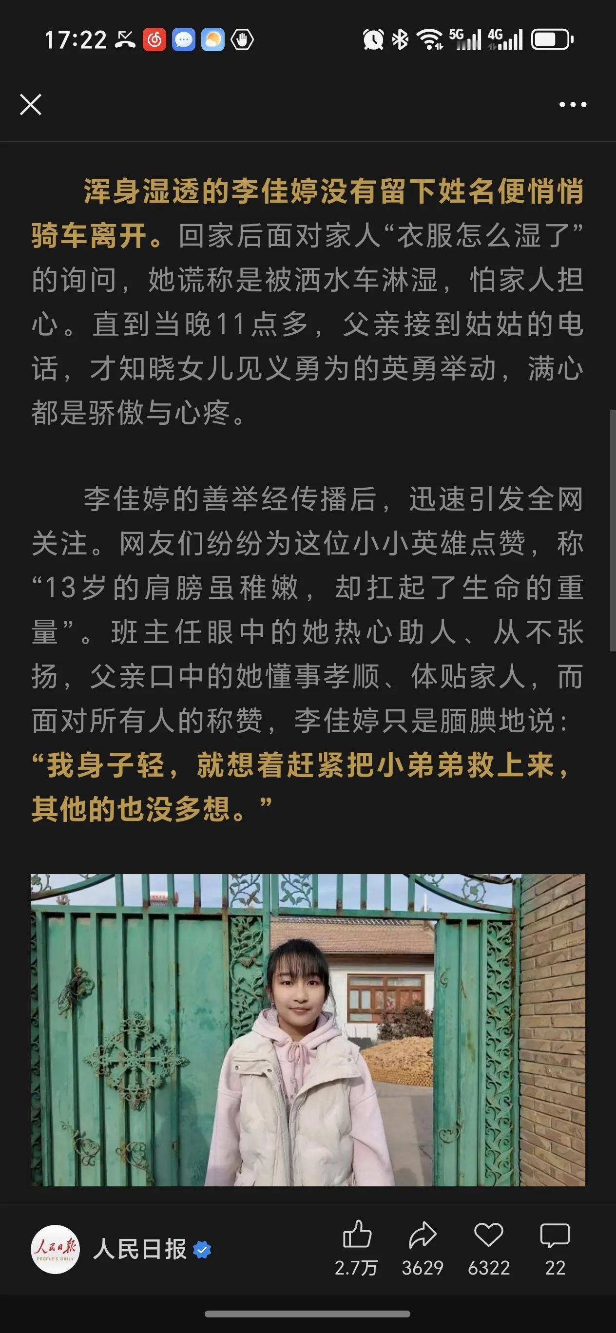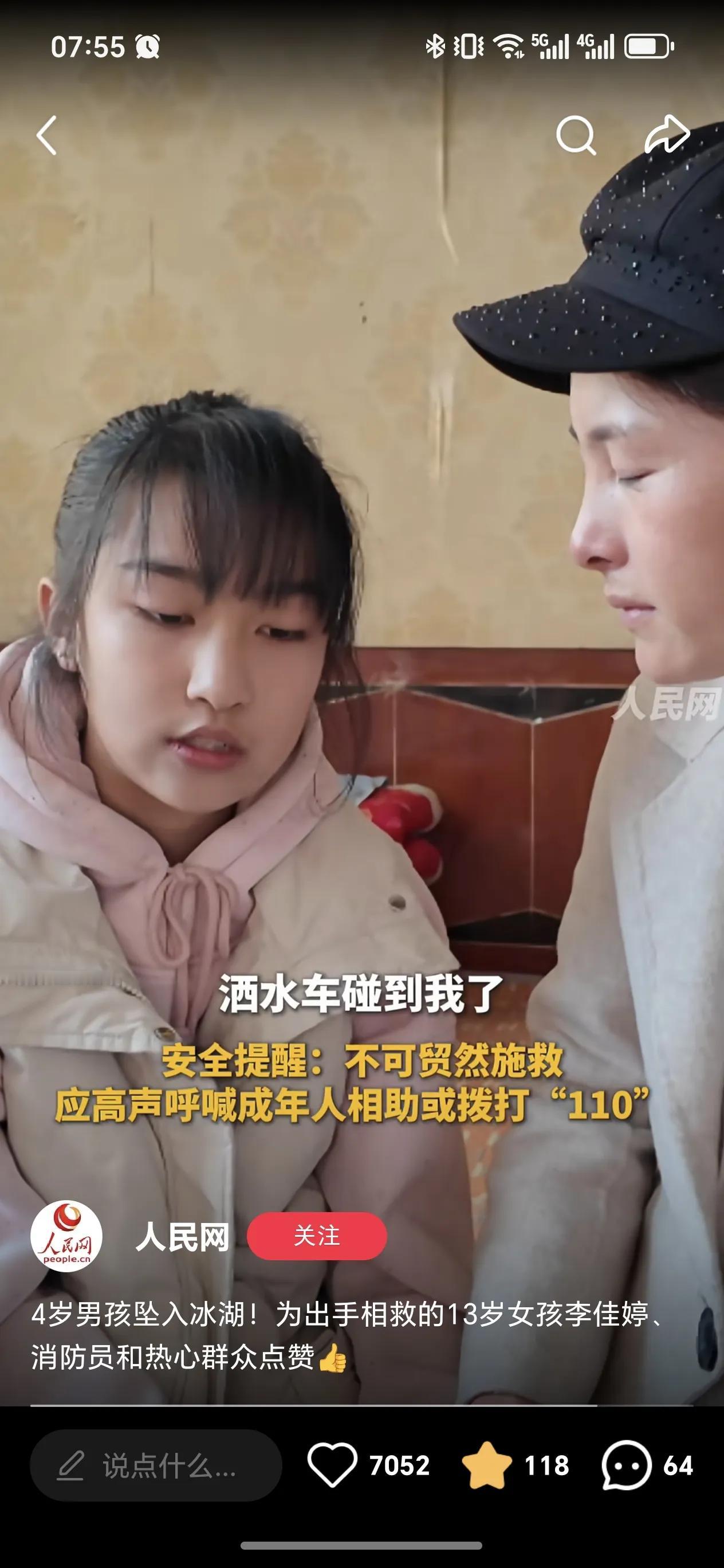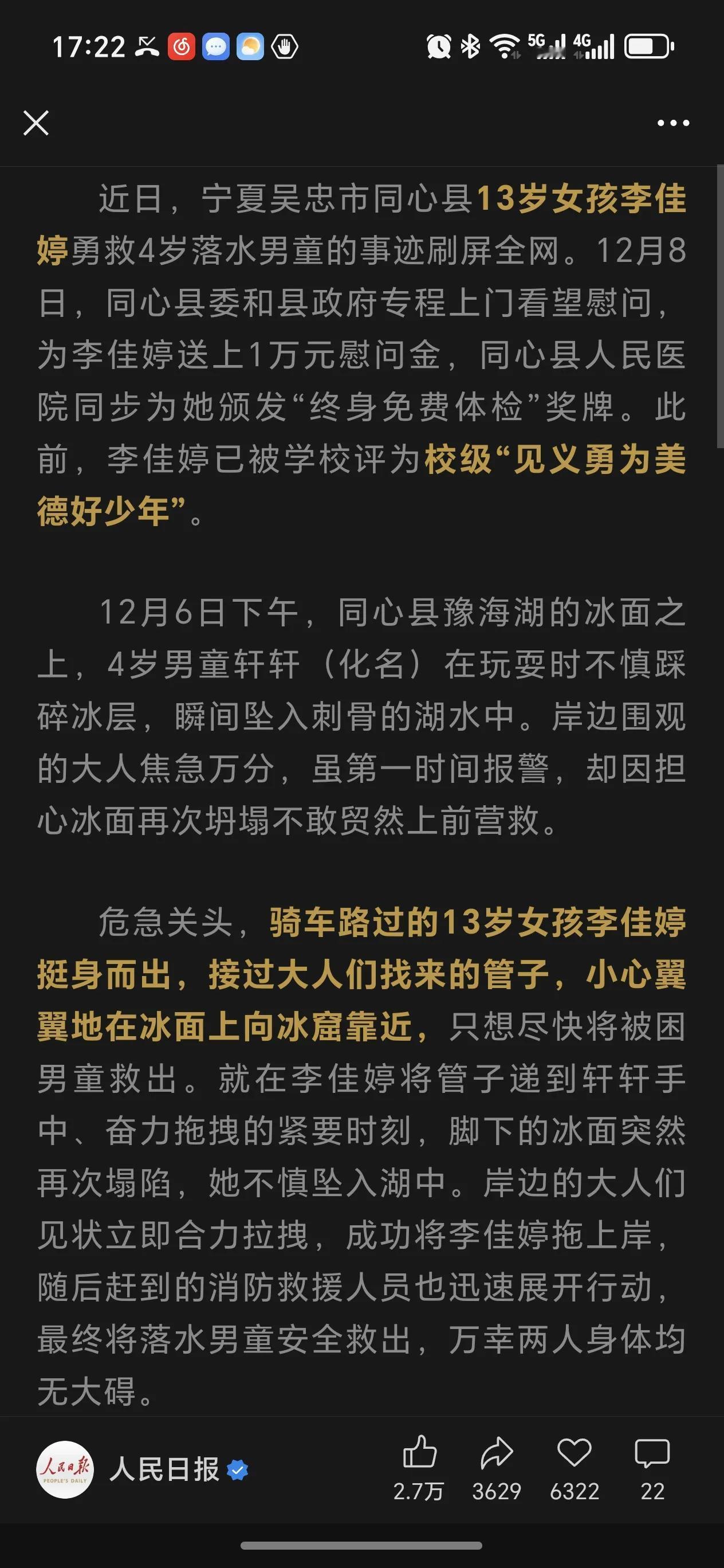 优秀!这就是冰窟救儿童的李佳婷,原来她才13岁,上初一。 1万慰问金、终身免费体检奖牌、见义勇为美德好少年…这些奖励实至名归,是对她最好的褒奖! 面对落水儿童,她主动请缨,挺身而出; 冰窟塌陷,河水冰冷刺骨,她没有退缩; 孩子救上来之后,她悄然离去,深藏功与名… 13岁的李佳婷用“我身体轻,我来救”的果敢,在冰窟前撑起生命的希望。 陷入冰窟后,她紧攥管子不松手,事后的悄然离场和“洒水车谎言”,彰显最纯粹的善良。 她是宁夏的学生,儿童的时候,就对消防员情有独钟; 救人后,她之所以悄然离场,原来是因为怕耽误消防员救人; 事后没有立即告诉父母,是怕父母担心…… 她奋不顾身的担当、体谅父母的孝心、对消防员的崇敬…少年英雄用她的壮举,温暖了整个寒冬!点赞!! (来源:青春宁夏、人民日报)
