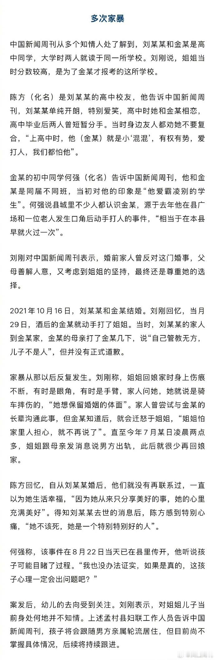 【金昊初中就爱霸凌别的学生】金昊被判处死刑金某的初中同学何强(化名)透露,他和金某是同届不同班,当初对他的印象是“他爱霸凌别的学生”。受害者弟弟刘刚(化名)表示,婚前家人曾反对这门婚事,父母善解人意,又考虑到姐姐的坚持,最终还是尊重她的选择。2021年10月16日,刘某某和金某结婚。刘刚回忆,当月29日,酒后的金某就动手打了姐姐。当时,刘某某的家人到金某家,金某的母亲打了金某几下,说“自己管教无方,儿子不是人”,但并没有正式道歉。家暴从那以后反复发生。刘刚称,姐姐回娘家时身上伤痕不断,有时是眼角,有时是手臂,家人问她,她就说是骑车摔伤的,“她想保留婚姻的体面”。家人曾尝试与金某的长辈沟通此事,但金某知道后,就会迁怒于姐姐,“姐姐怕家里人担心,就不再说了”。直至今年7月某日凌晨两点多,姐姐跟母亲发消息说男方出轨,此后就很少再回娘家。受害者家属在案发现场看到,东南卧室床单、墙面和地板均留有血迹与清理痕迹,卫生间和另一卧室也残留有血渍。(中国新闻周刊)